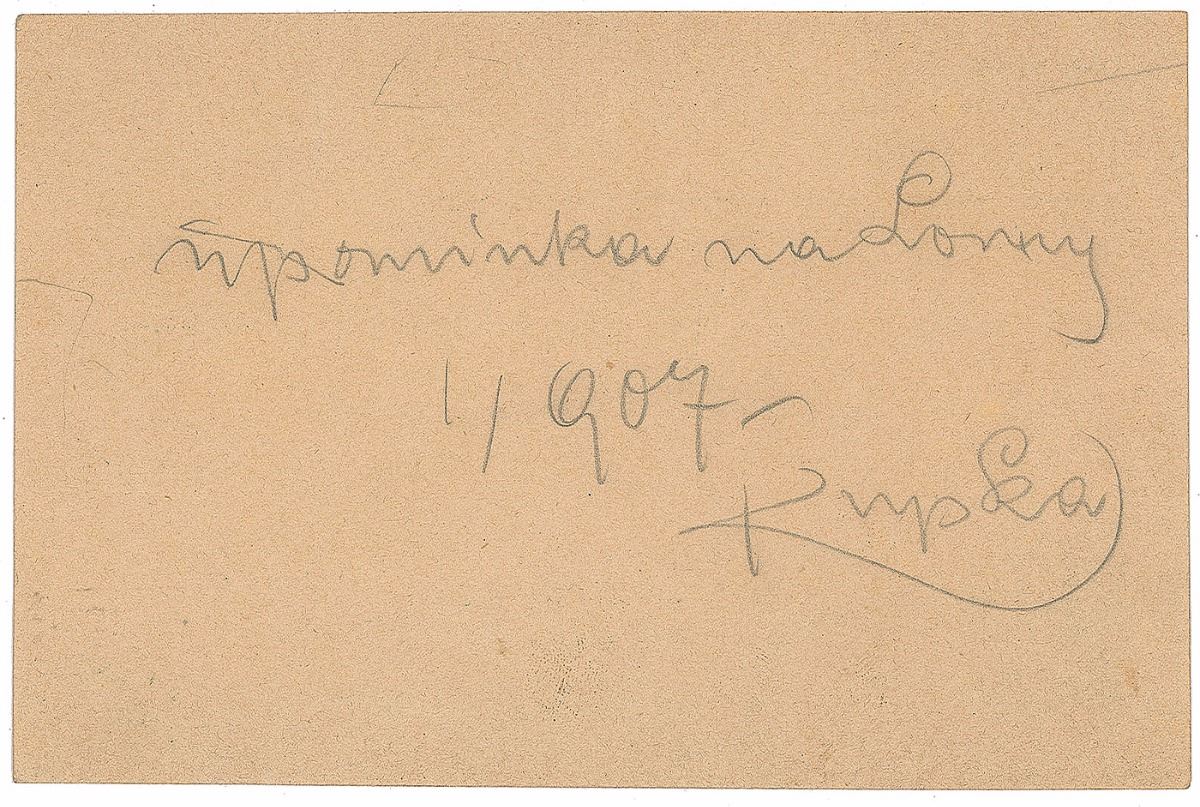 Czech painter and graphic artist (1871–1957) who was a prominent figure in establishing the early phases of the abstract art movement and Orphic cubism. Rare pencil signature, “Kupka,” and inscription in Czech on an off-white 5.5 x 3.75 card dated 1907. In fine condition.