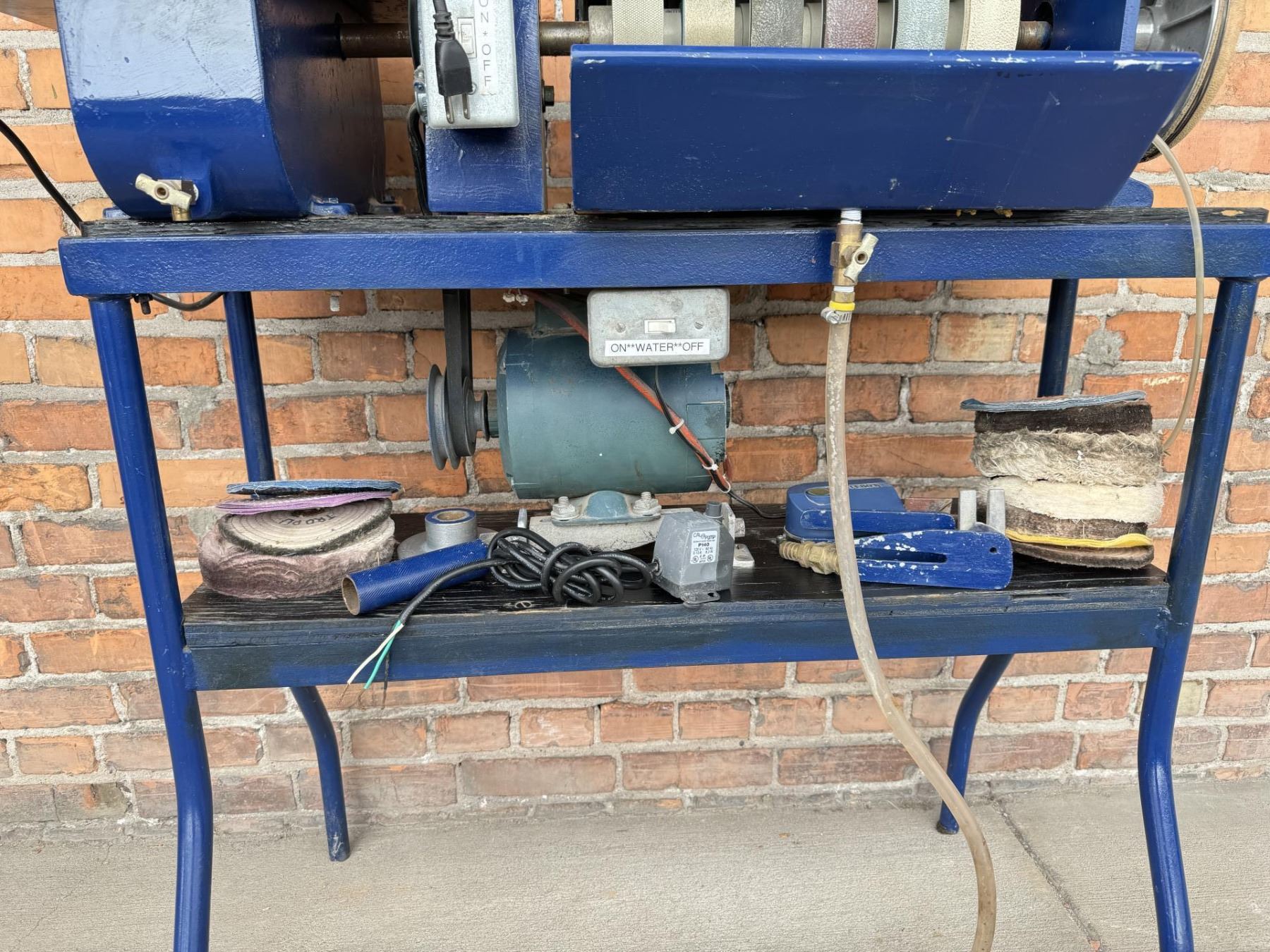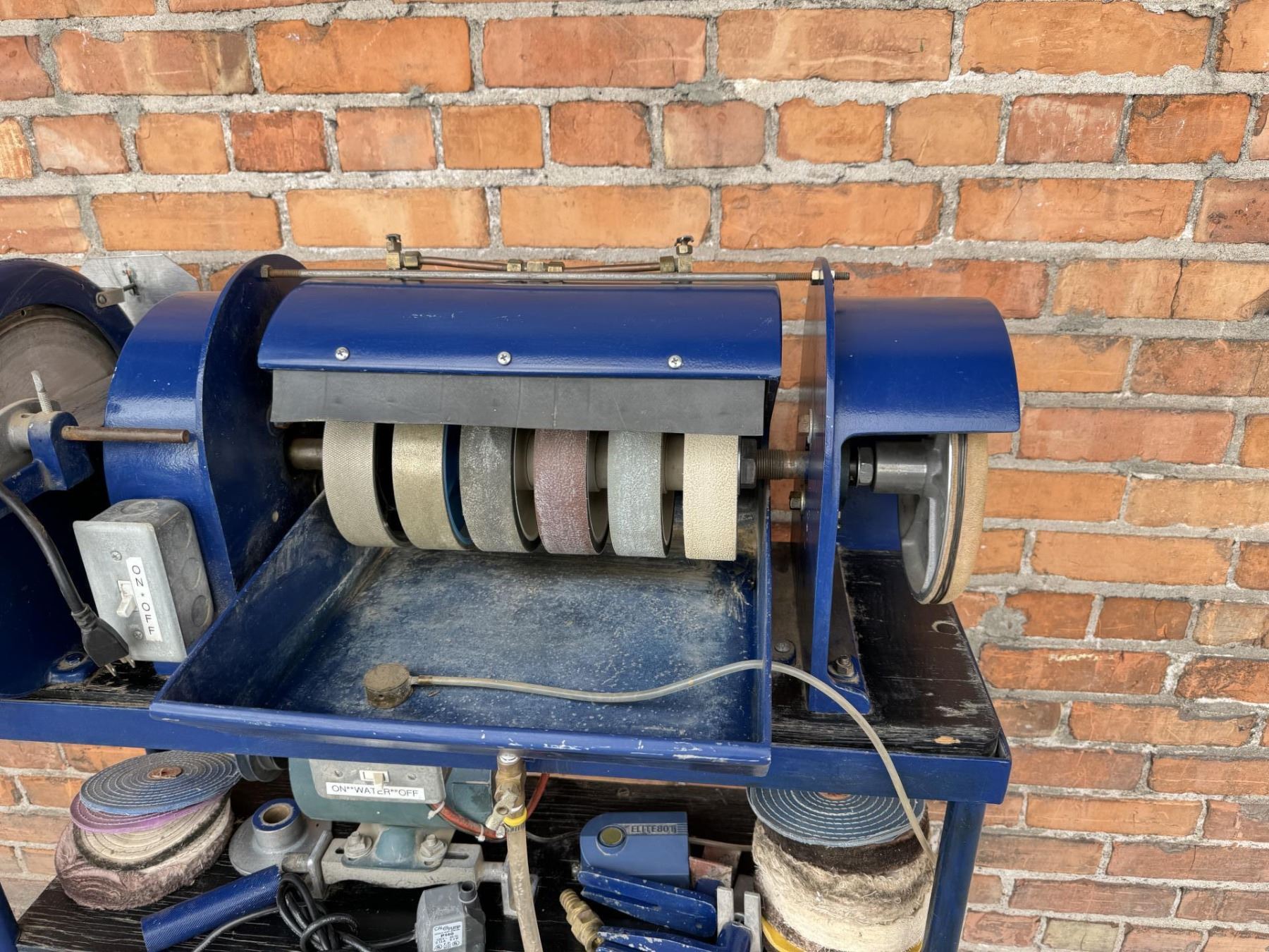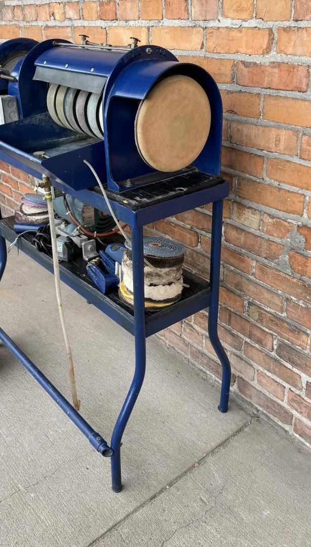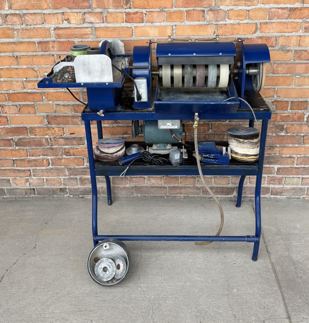 Very nice complete setup. Buffing wheel is 8", cutting wheel is 10". 40" by 44" by 19". Machine will be packed in several boxes. Buyer is welcome to pickup at our facility or pay LTL freight.