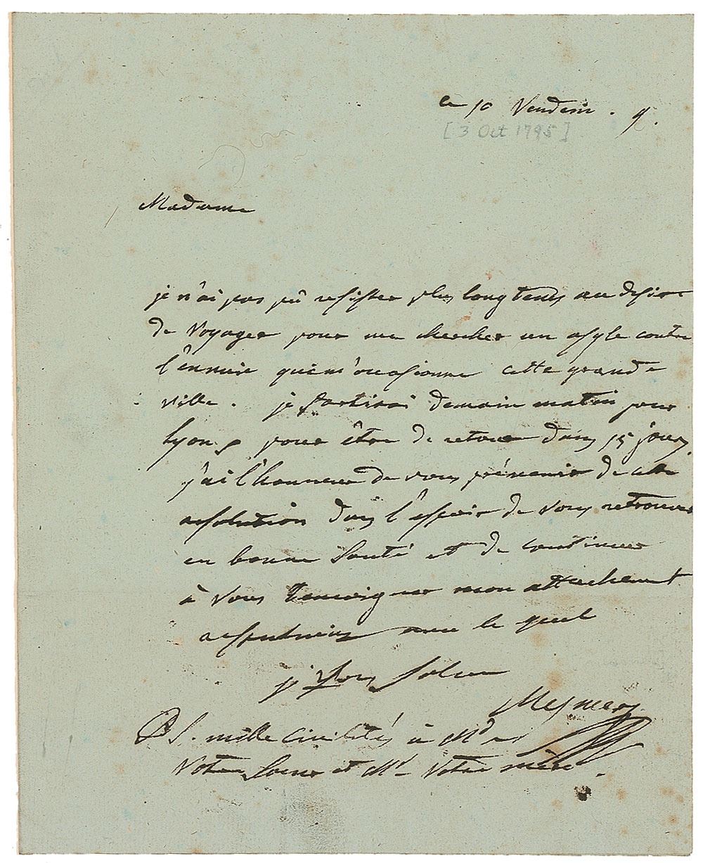 Excessively rare ALS in French, signed "Mesmer," one page, 6.75 x 8.25, October 3, 1795. Letter to Madame Cardon of Versaille, in full (translated): "I haven't been able to resist any longer my desire to travel and seek some asylum against the boredom caused by this huge city [Paris]. I will leave tomorrow morning for Lyon and will be back in 15 days. I have the honor of warning you about the situation in the hope that I will find you in good health, and continue to testify my affectionate attachment with which I greet you." He also adds a handwritten postscript, in full: "All my friendly remembrances to madame your mother." In fine condition, with scattered light foxing, and repaired seal-related paper loss to the integral address leaf.
