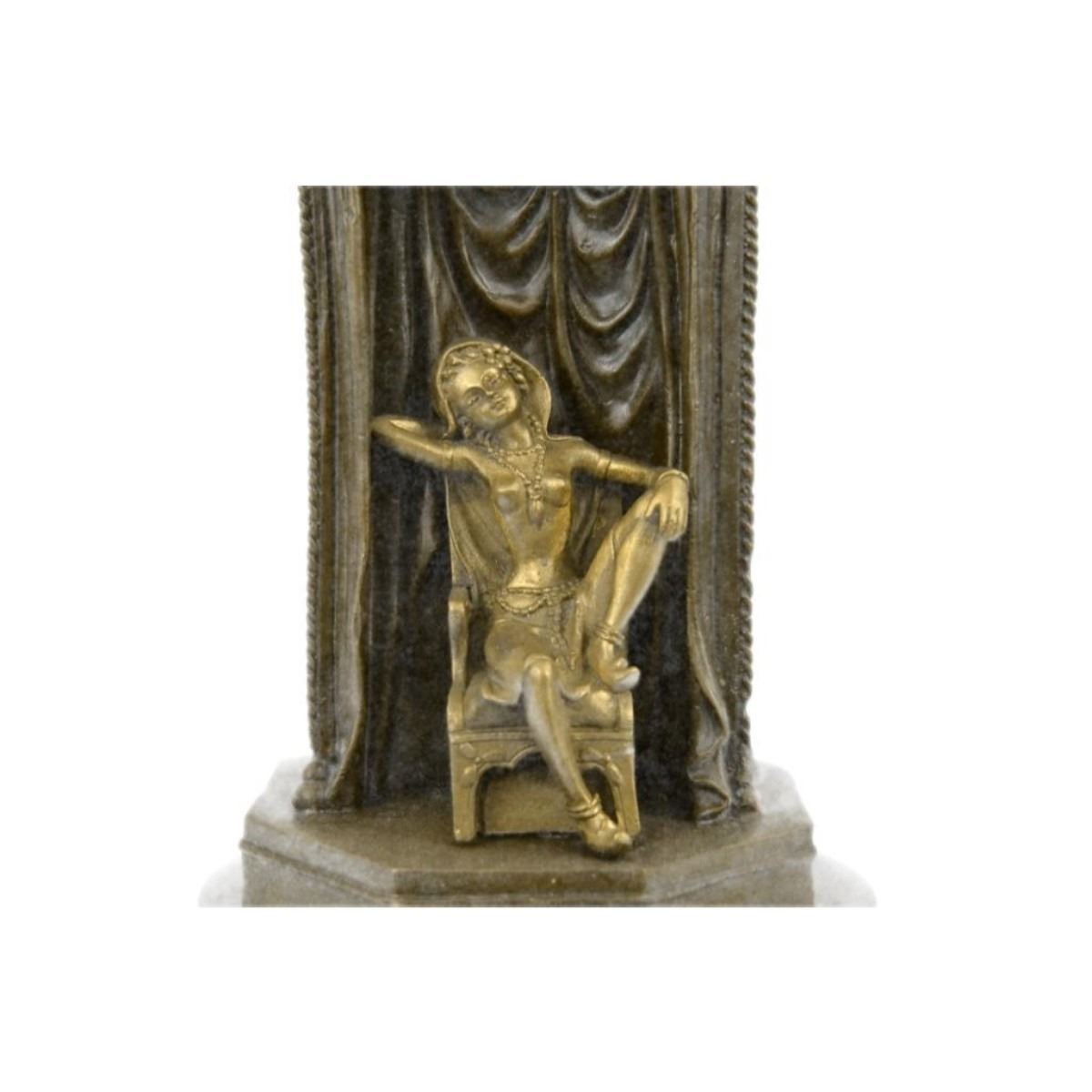 After Franz Xaver Bergmann ( 1861 - 1936 ) owner of a Viennese foundry that produced numerous patinated & cold painted bronze Oriental & erotic sculptures. He would use the signature Nam Greb his name backwards asthe signature on any erotic subjects. The subject of this sculpture - an Arab guard is protecting a young slave girl in a harem. On one side, the Arab guard & on the reverse, the young slave girl. Lost wax casting method bronze, with brown patina & added gold gilt, mounted on a marble pedestal. 14" X 6". 12lbs.