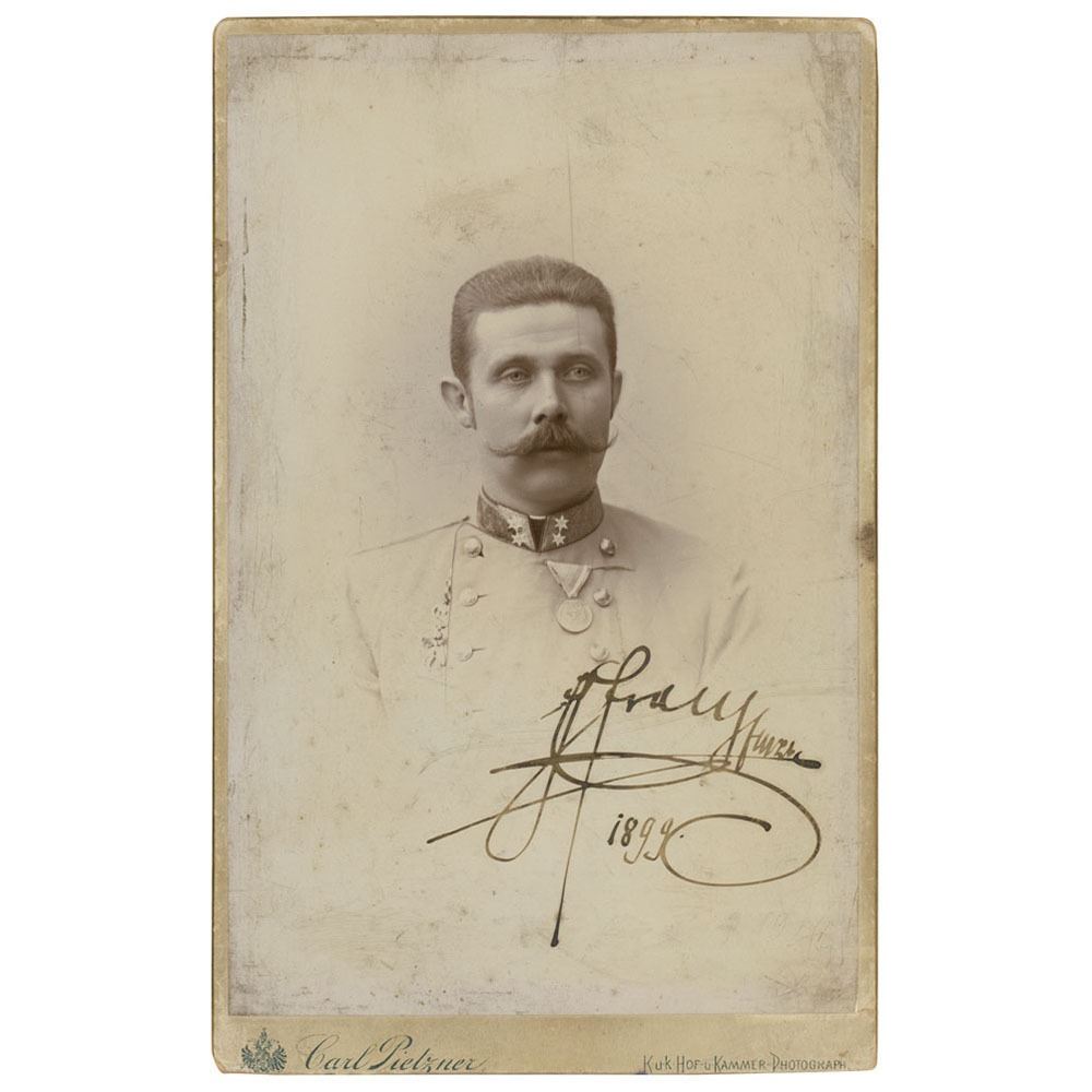 Rare 5.25 x 8.5 Boudoir cabinet card photo of Franz Ferdinand in his military uniform, prominently signed in black ink and dated 1899. Published by Carl Pietzner of Vienna. In very good condition, with scuffing, soiling, and scratching (a vertical scratch passes through the left side of Ferdinand's face). A highly sought-after icon of world history.