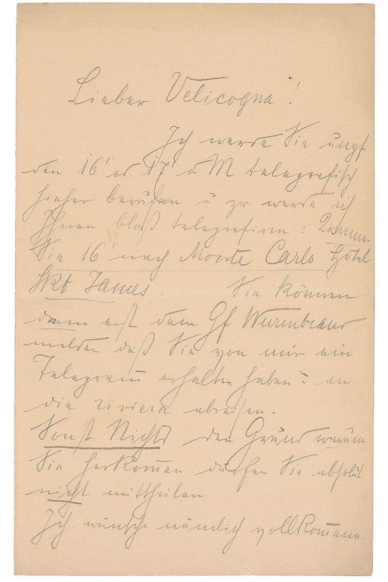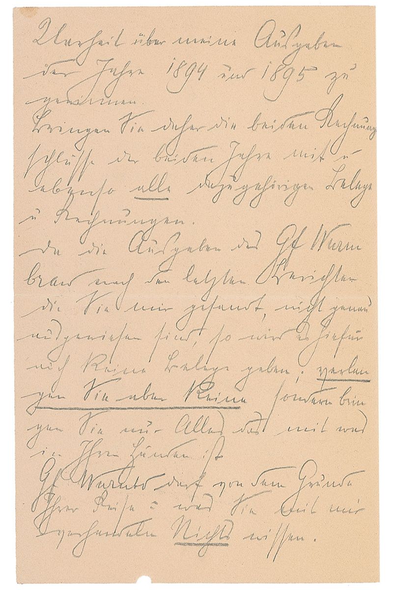 The expenditures of Count Wurmbrand, according to the latest reports which you sent me, are not adequately identified, so there will be no documents relating to them; but do not ask for any. Bring with you to me, however, everything which is in your hands. Count Wurmbrand is to know nothing of the reasons for your journey and of what you will be discussing with me. This instruction supersedes the one in my last letter, and you need not send the statements, but bring everything with the documents. I am sorry that I have to make you undertake this long journey, but I cannot return to the home country before 1st May. Should you, however, chance to feel indisposed at the time, do not come and telegraph to me; I am absolutely determined not to overtax you, and I can have you come later. This letter counts as ‘official secret.’” In fine condition, with small chip to bottom edge.