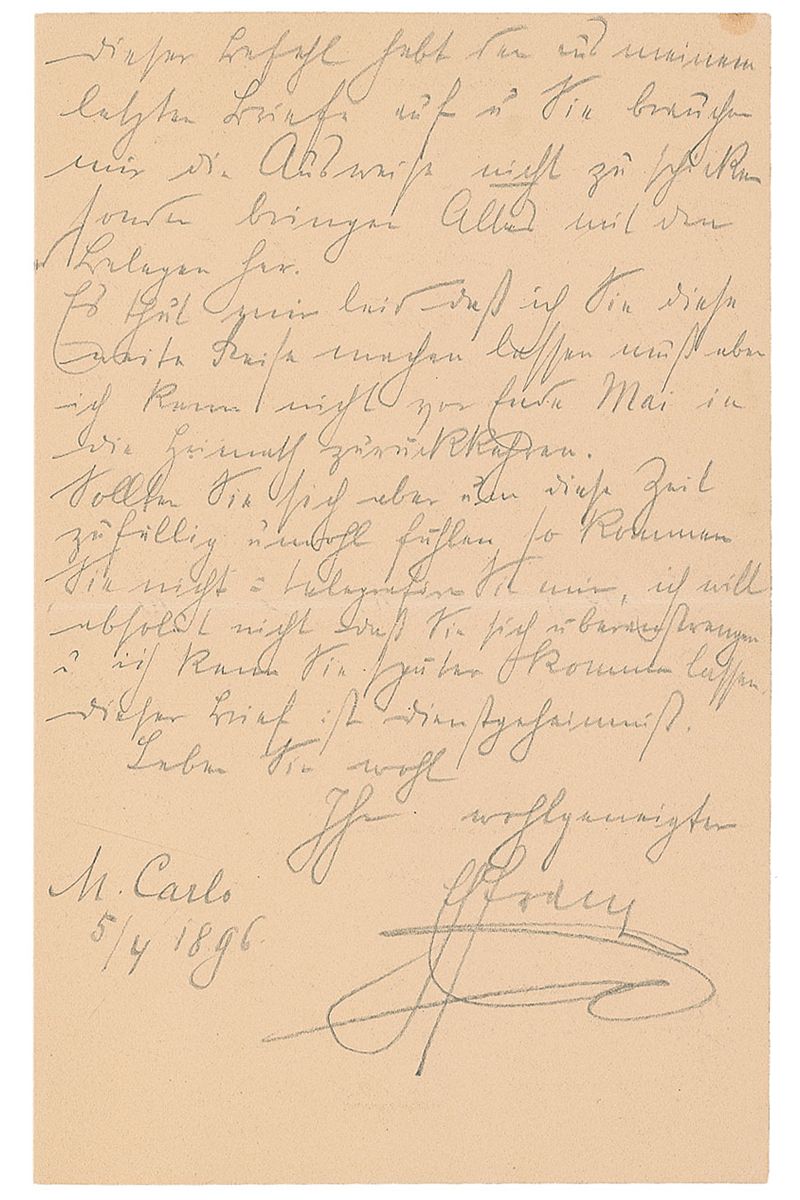 Archduke of Austria (1863–1914) whose assassination precipitated the start of World War I. ALS in German, signed “Franz,” three pages on two adjoining sheets, 5 x 8, Monte Carlo, May 4, 1896. Letter to Velicogna. In full (translated): “I shall call you here by telegram on about the 16th or 17th of the month and I shall in fact, merely say in the telegram 'Come 16th St James Hotel Monte Carlo.' You can then just tell Count Wurmbrand that you have received a telegram from me and that you are leaving for the Riviera. Apart from that, nothing. You must not say anything at all about the reason why you are coming here. I want, in fact, to gain a completely clear picture of my expenditure in the years 1894 and 1895. So bring both statements of account, covering the two years, together with all documents and audits relating to them.