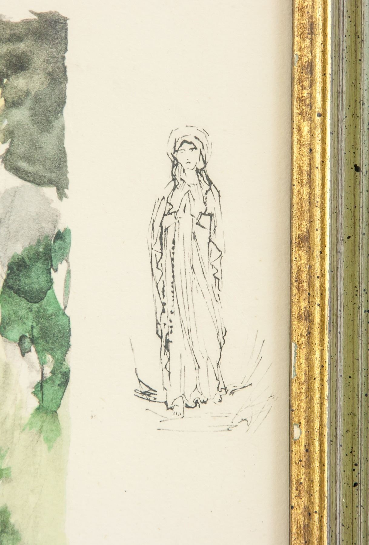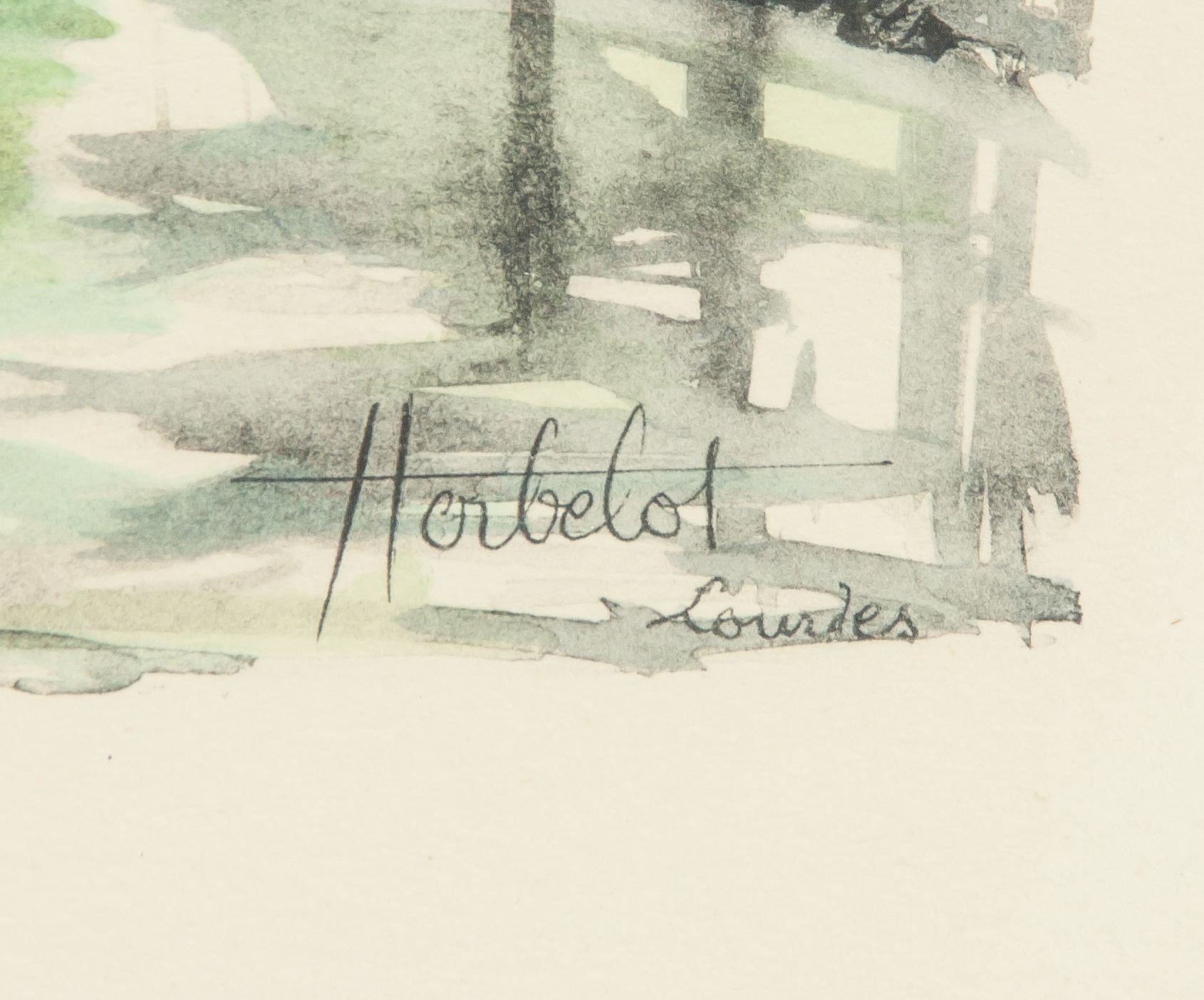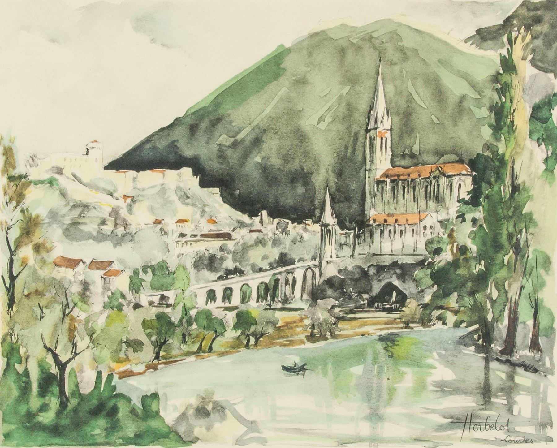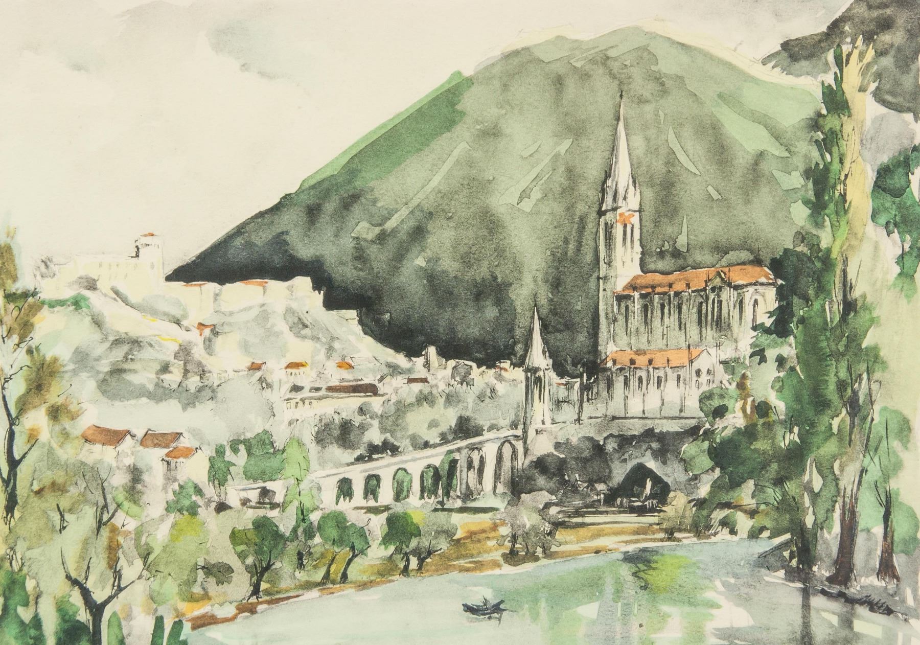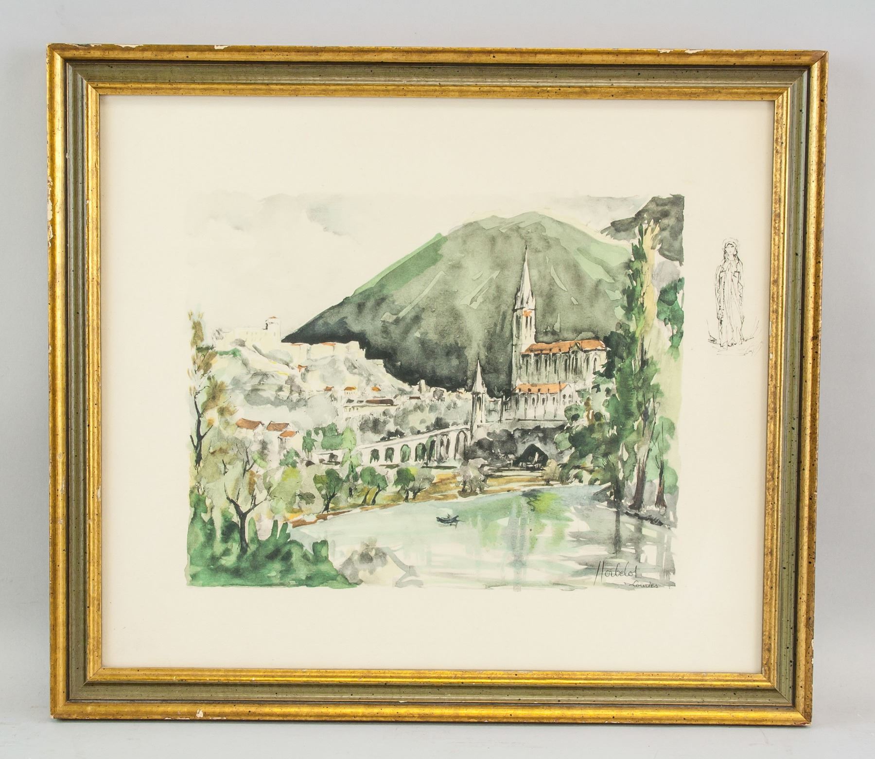 Watercolor on paper framed, featuring castle, mountain and river scene. Signed and attr. French artist Franz Herbelot. Signature on the lower right corner. Herbelot first made rough on-site street sketches which were unsigned and bear only the location name. These sketches were later reproduced in his studio. It is the lithograph prints and the line drawings with watercolors added which bear his “Herbelot” identity and issued numbers. 22 x 27 cm