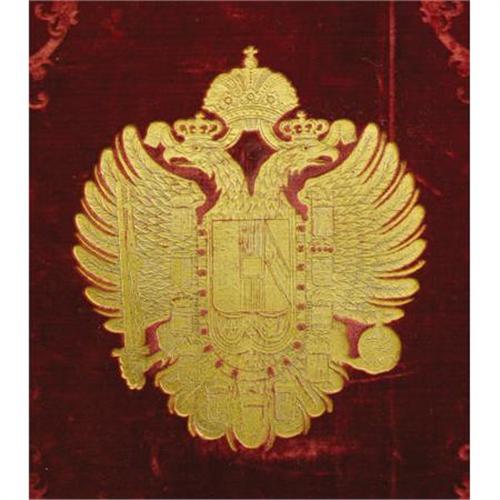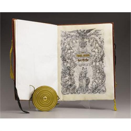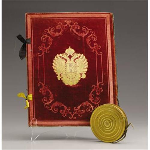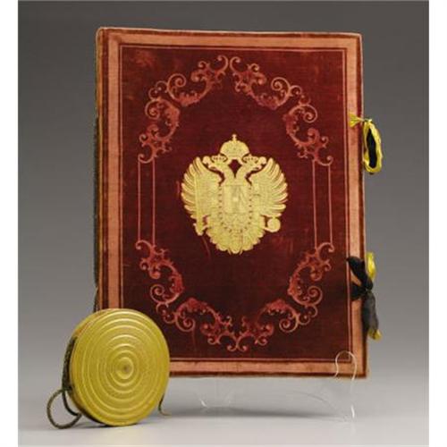 <B>Fine Austro-Hungarian Franz Josef Portfolio Containing Patent of Nobility for Henrich Ritter von Lebzeltern with Attached Seal</B></I><BR><BR>Franz Joseph I, Emperor of Austria (1830-1916) Patent of Nobility and Grant of Arms, the covers of red velvet, each side embossed with the Austro-Hungarian double-headed eagle with ribbon ties, containing seven documents in German, some double sided, one with hand painted coat of arms, one signed, the spine attached to the seal box by a cord-Portfolio- 15 in. long; the seal box-4 5/8 in. diam.<BR><BR>Provenance:<BR>Purchased from Triple Pier Show, New York<BR><BR><b>Shipping:</b> Requires 3rd Party Shipping (<a target="_blank" href="http://www.heritageauctions.com/common/shipping.php">view shipping information</a>)