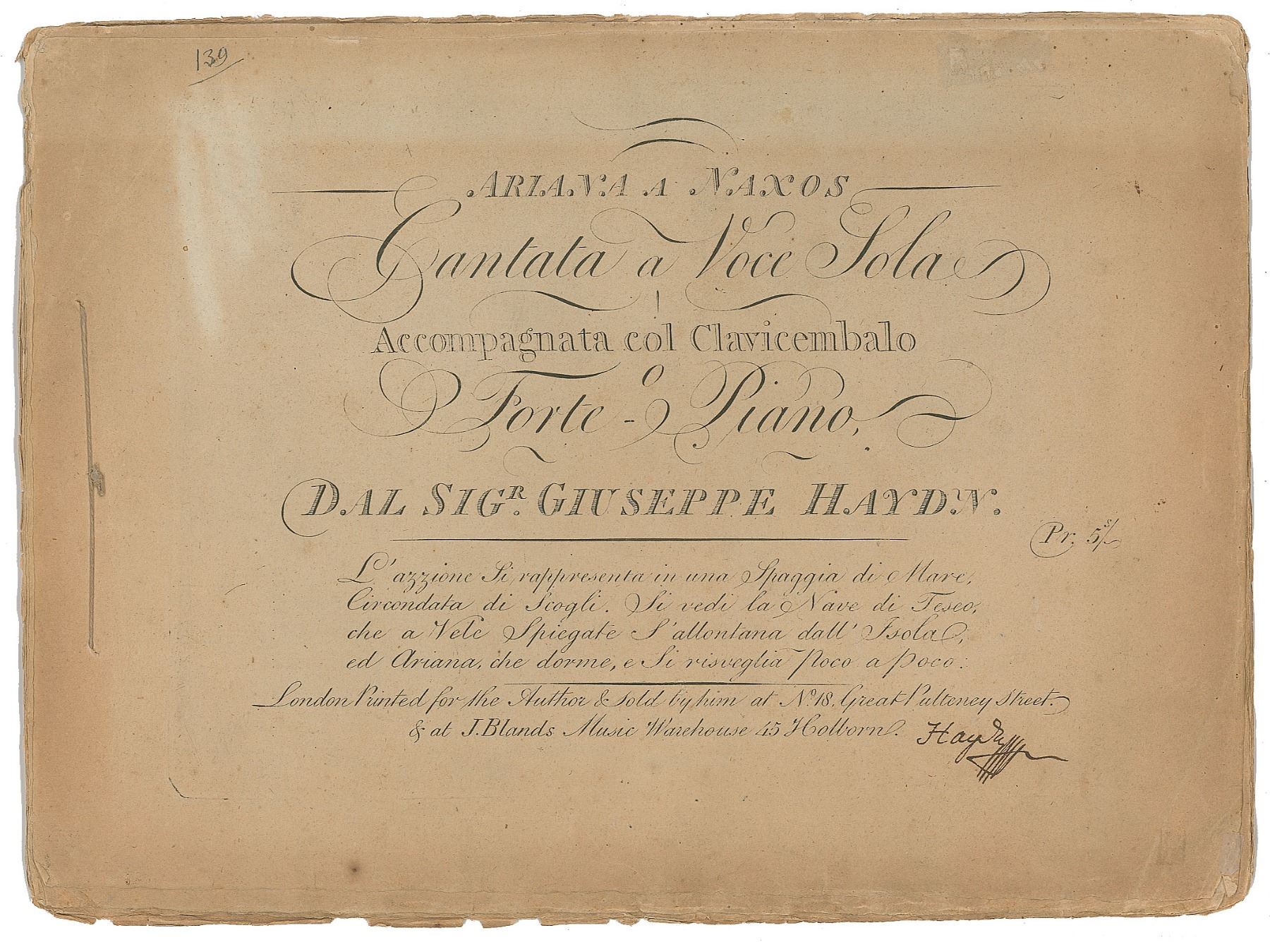 The publisher, John Bland, was instrumental in bringing Haydn to London and provided his first lodging there in January 1791. 'Arianna' was performed in London in February by the soprano castrato Gasparo Pacchierotti, with Haydn accompanying on the harpsichord. Haydn later regarded the two periods he spent in the British capital (1791-92 and 1794-95) as the happiest of his life.