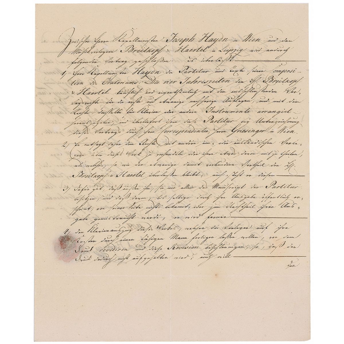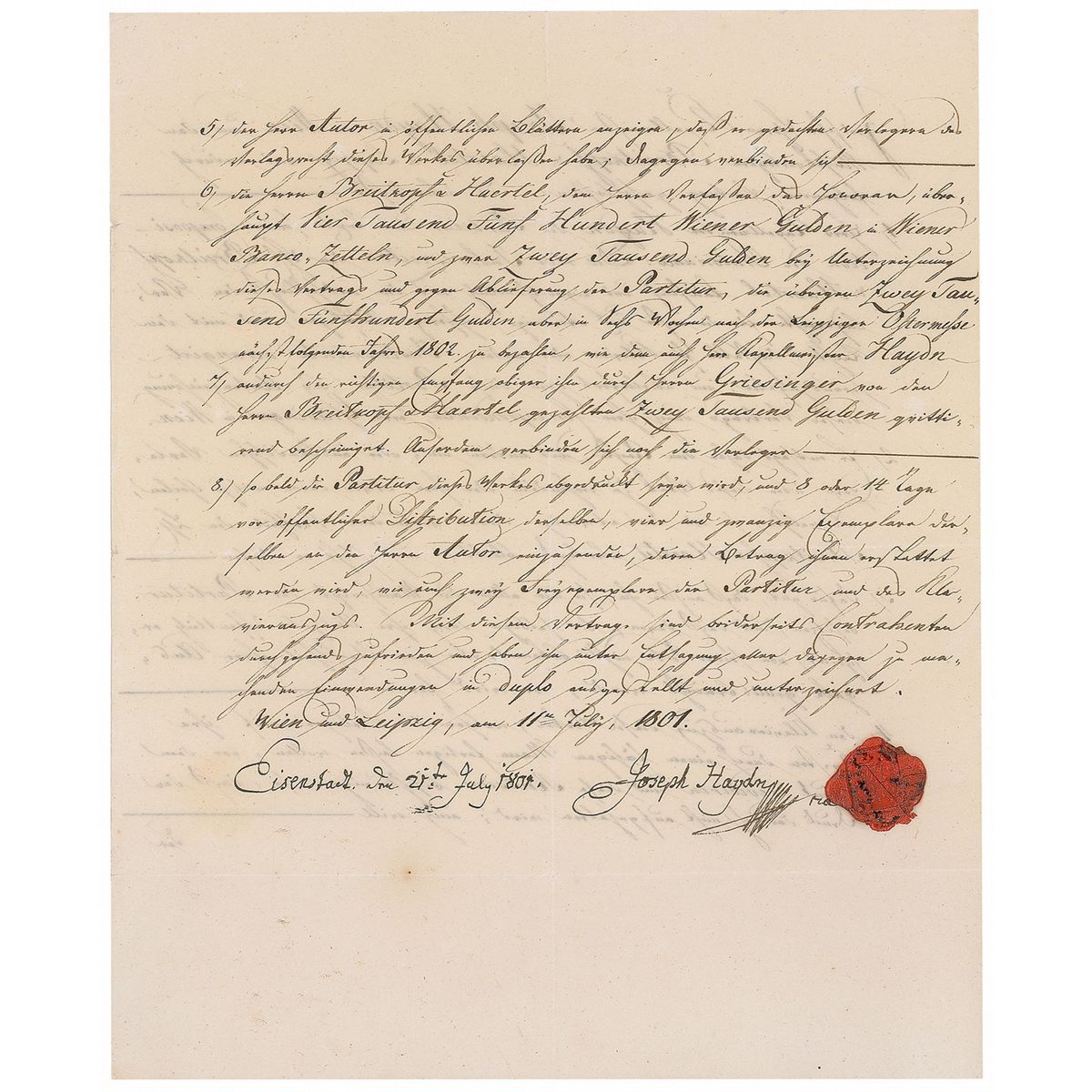 Excessively rare and extremely desirable manuscript DS in German, one page both sides, 8 x 9.75, July 21, 1801. Untranslated contract in which Haydn cedes publication rights to his oratorio ‘The Seasons’ to Breitkopf & Haertel. Haydn agrees not to sell the work to third parties or make it available to any third parties before publication. He also agrees to copyedit the proofs in due time and to publicly announce having transferred the said publishing rights. Breitkopf & Haertel agree to pay a total royalty of 4500 Viennese florins, 2000 of which are to be advanced at the time of undersigning. Beautifully signed at the conclusion by Haydn, who adds the place and date, “Eisenstadt 21st July 1801,” affixing his monogrammed wax seal, impressed with the initials “JH,” to the right of his signature. In fine to very fine condition, with intersecting folds, writing lightly showing through from opposing sides, a miniscule edge tear, and toning to first page due to wax seal; flaws are mentioned for the strictest of accuracy and do not detract from the essentially pristine appearance of this crisp, boldly signed document.