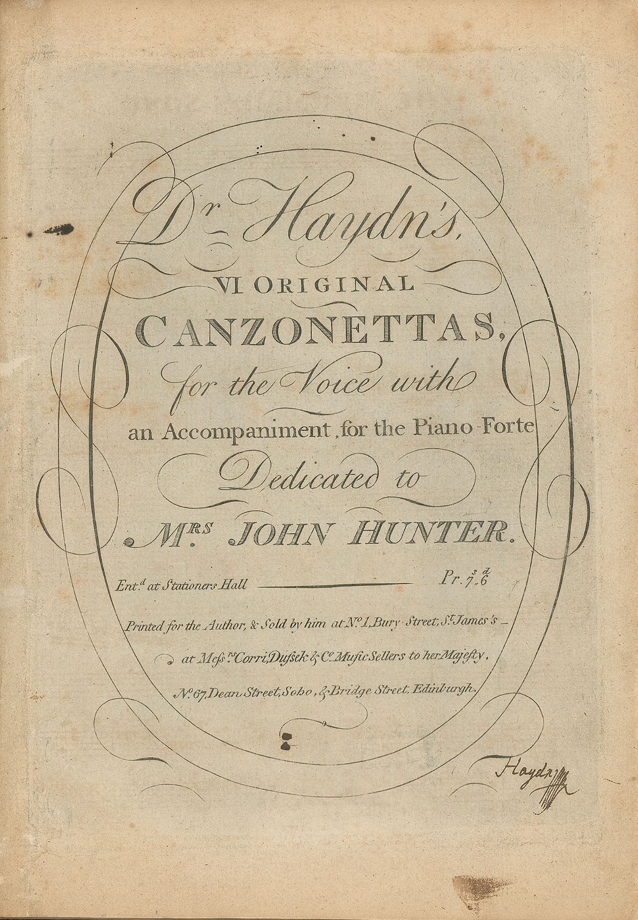 Exceptionally rare signed music score for ‘Dr. Haydn’s VI Original Canzonettas, for the Voice with an Accompaniment for the Piano-Forte,’ with dedication to Mrs. John Hunter, ‘Printed for the Author, & Sold by him at No. 1 Bury Street, St. James’s, at Mess’rs Corri, Dussek & Co., Music Sellers to her Majesty, No. 67, Dean Street, Soho, & Bridge Street, Edinburgh,’ no date but circa June 1794, 9.5 x 13, 31 pages, signed in the lower right of the title page in bold ink, “Haydn.” The score contains six songs—I. 'The Mermaids Song,' II. 'Recollection,' III. 'A Pastoral Song,' IV. 'Despair,' V. 'Pleasing Pains,' and VI. 'Fidelity.' Expertly bound in quarter dark brown mottled calf with marbled boards, and the spine accented with dark red leather and gilt titling. In fine condition, with the pages having been conserved with paper-casting to strengthen the edges.