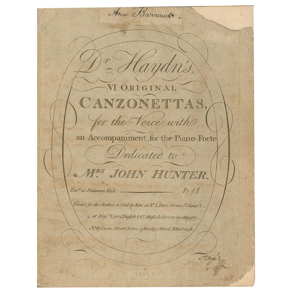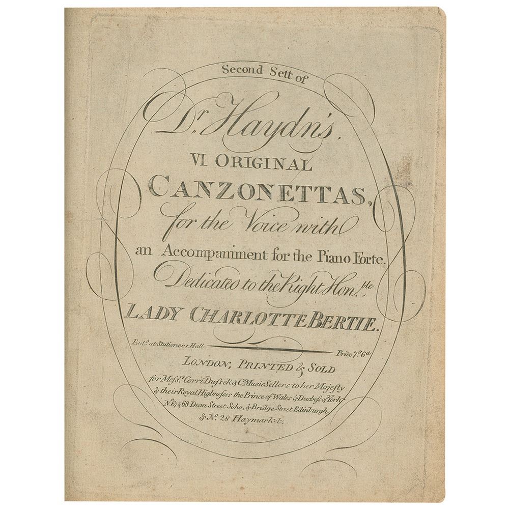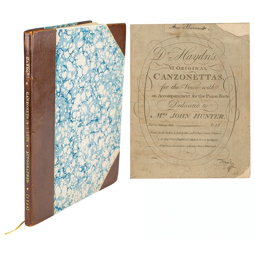 Exceptionally rare signed music score for ‘Dr. Haydn’s VI Original Canzonettas, for the Voice with an Accompaniment for the Piano-Forte,’ with dedication to Mrs. John Hunter, ‘Printed for the Author, & Sold by him at No. 1 Bury Street, St. James’s, at Mess’rs Corri, Dussek & Co., Music Sellers to her Majesty, No. 67, Dean Street, Soho, & Bridge Street, Edinburgh,’ no date but circa June 1794, 9.5 x 13, 31 pages, signed in the lower right of the title page in bold ink, “Haydn.†The score contains six songs—I. 'The Mermaids Song,' II. 'Recollection,' III. 'A Pastoral Song,' IV. 'Despair,' V. 'Pleasing Pains,' and VI. 'Fidelity.' Lavishly bound with the unsigned "Second Sett of Dr. Haydn's Original Canzonettas" in quarter dark brown calf with marbled blue boards, and the spine titled in gilt. In very good to fine condition, with light overall soiling, and professional restoration to two missing corners of the signed page.