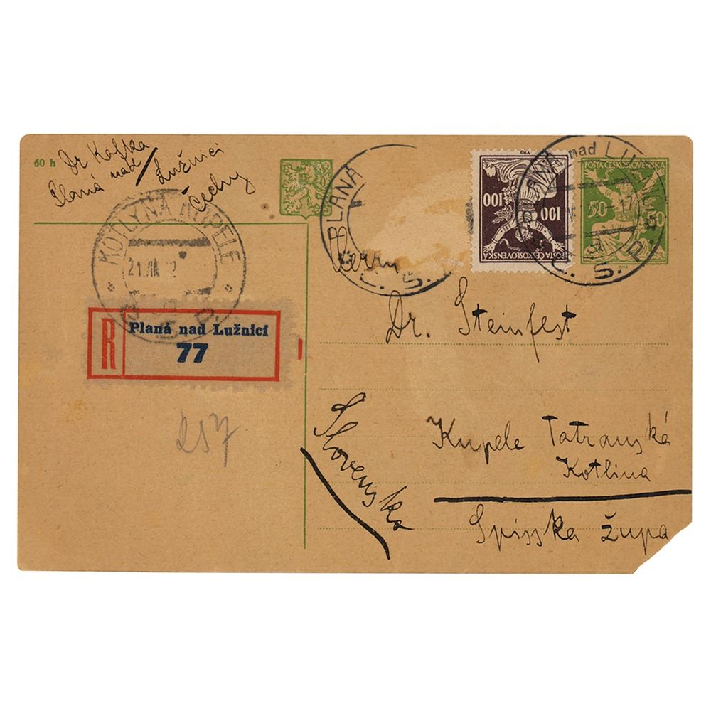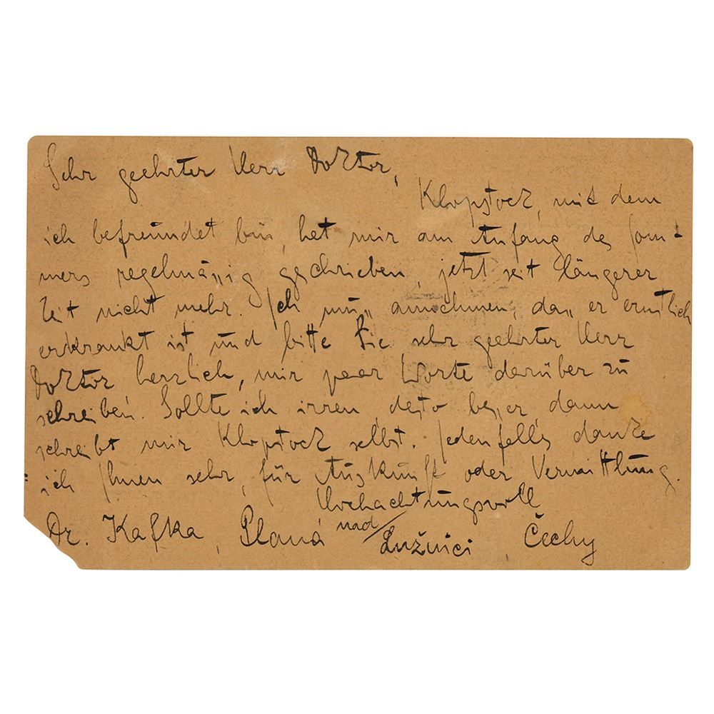 Rare ALS in German, signed twice, “Dr. Kafka,” one page on a 5.5 x 3.5 postcard, postmarked July 21, 1922. Handwritten letter to "Dr. Steinfest" in the medical settlement of Tatranská Kotlina, inquiring about the health of his close friend, Dr. Robert Klopstock. In full (translated): "Klopstock, with whom I am friends, wrote to me regularly at the beginning of summer, but he has not written for a long time. I have to assume that he is seriously ill, and I kindly ask you, dear doctor, to write me a few words about it. If I am wrong, the better, then Klopstock will write to me himself. In any case, thank you very much for the information and help." Addressed on the reverse in Kafka's hand, incorporating his signature, "Dr. Kafka," into the return address area. In fine condition, with minor loss to the lower left corner tip.