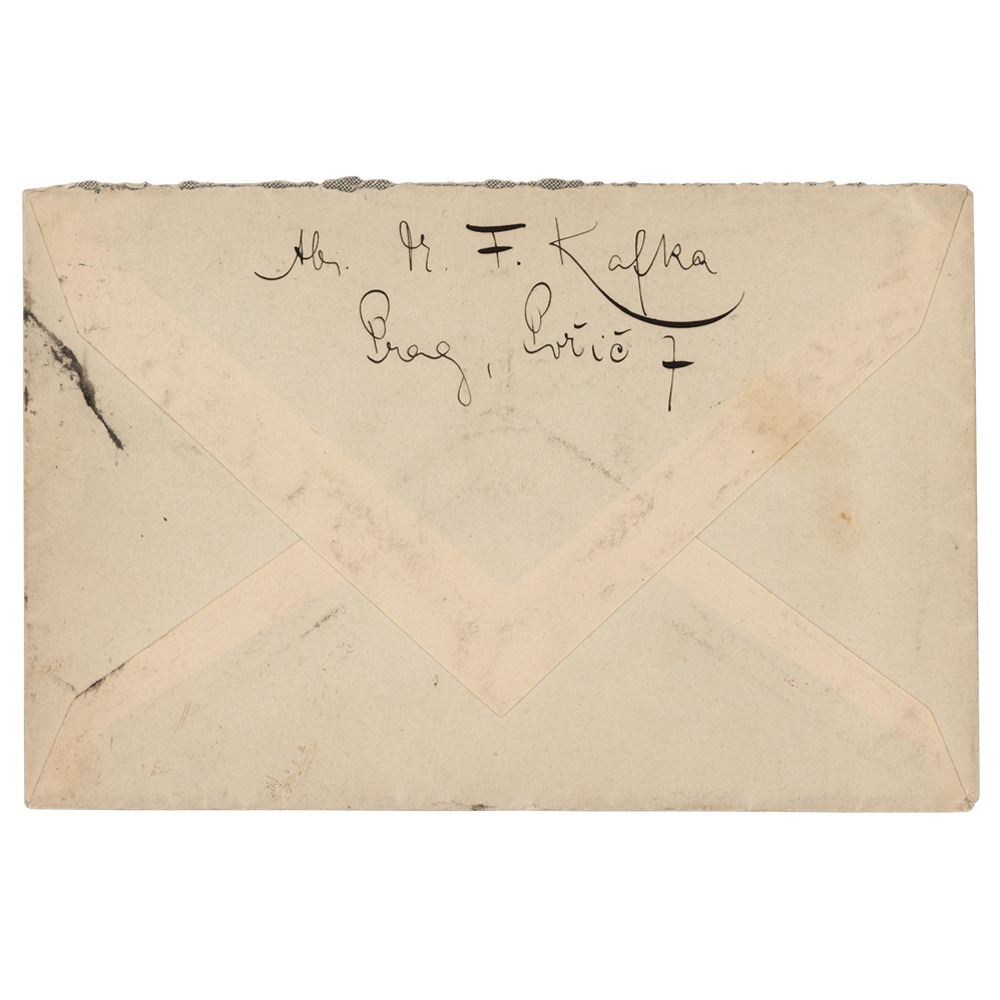 Much lauded and influential Czech-born writer (1883–1924) whose man-turned-insect story Metamorphosis (1915) and novel The Trial (1925) have earned a permanent and prominent place in the canon of modern literature. Sought-after hand-addressed mailing envelope, 6 x 4, addressed by Kafka to his fiancée, “Fraulein, Felice Bauer, Frankfurt 9/M, Hotel Monopol-Metropole,” signed on the reverse with his return address, "Abs. Dr. F. Kafka, Prag Poric 7.” Bauer's address has been struck through and corrected in another hand. Postmarked at Prague, April 19, 1913. In fine condition.