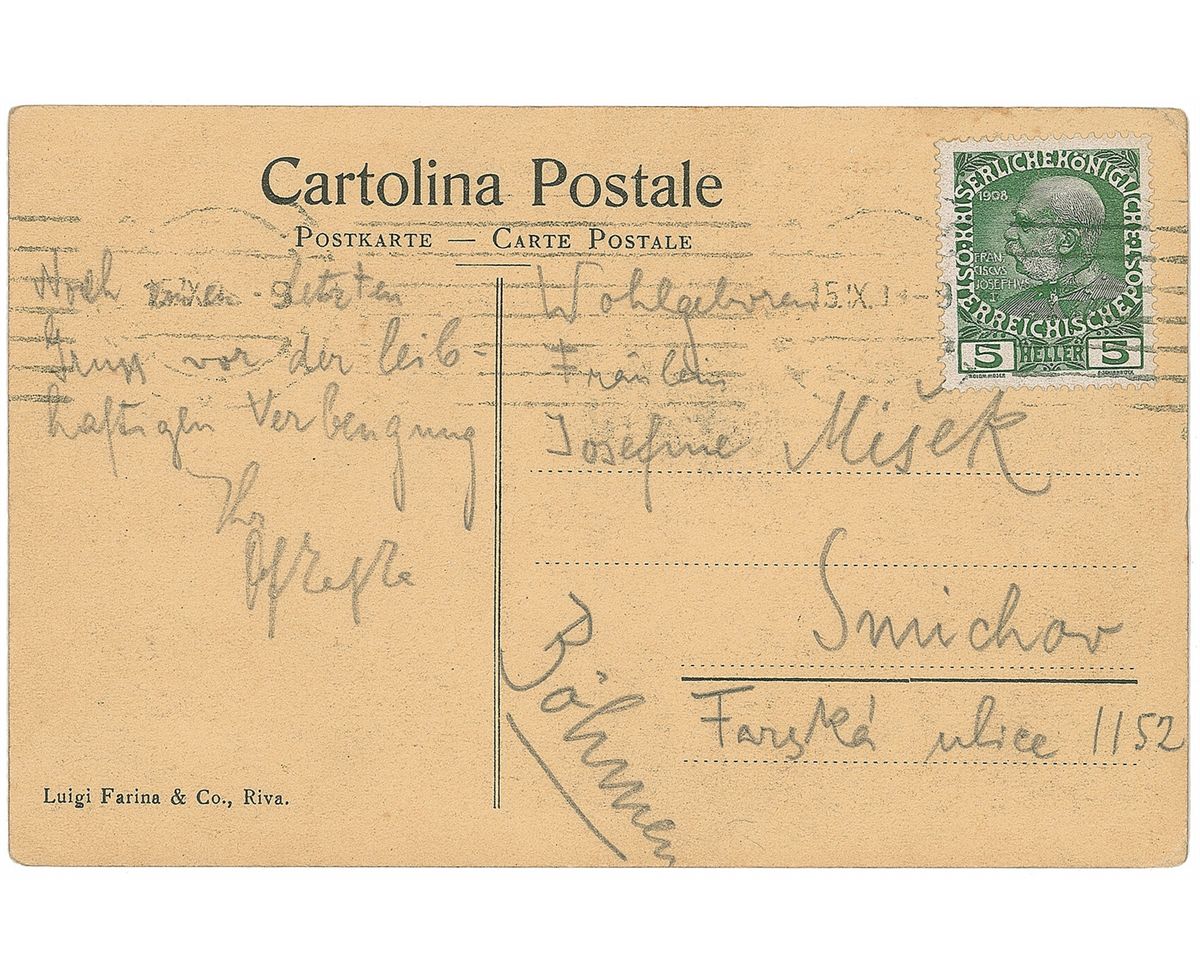 Rare ANS in pencil in German, signed “Dr. F. Kafka,” one page on a 5.5 x 3.5 postcard depicting Lago di Garda in Punta San Vigilio, postmarked September 14, 1909. Letter to Josefine Misek, in full (translated): “Just a last greeting before my personal obeisance.” In fine condition, with postal cancellation passing through the text but not affecting readability.