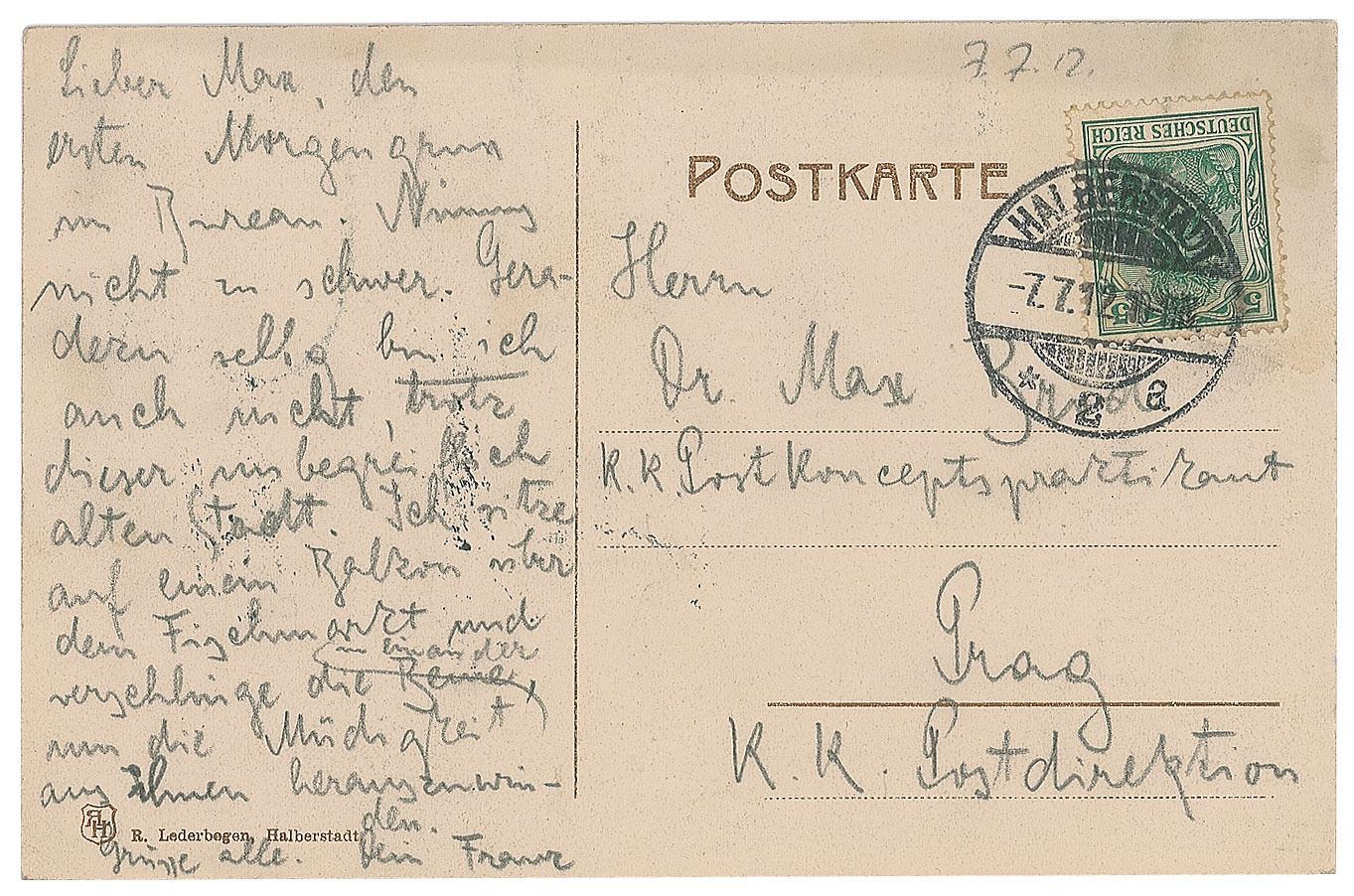 Traveling companions Kafka and Brod parted ways in early July after a summer sojourn in Weimar, with Kafka continuing on to the historic city of Halberstadt and Brod returning to Prague. This offered postcard represents one of the two letters Kafka sent to Brod on July 7th; the second was written after visiting the home of poet Johann Wilhelm Ludwig Gleim in Halberstadt, and not long before Kafka embarked to the Jungborn nudist sanitorium, where he remained for three weeks in an effort to cure a writing spell. His experience with naturopathy and his introduction to future fiancé Felice Bauer in mid-August stirred in Kafka a compulsion to expound deeper on the subject on the natural world, and in early November Kafka began work on an early draft of The Metamorphosis, a version of which he would finish before year's end.