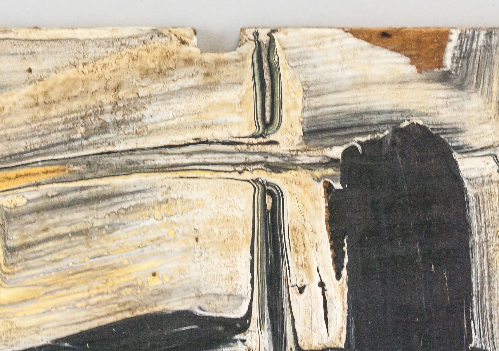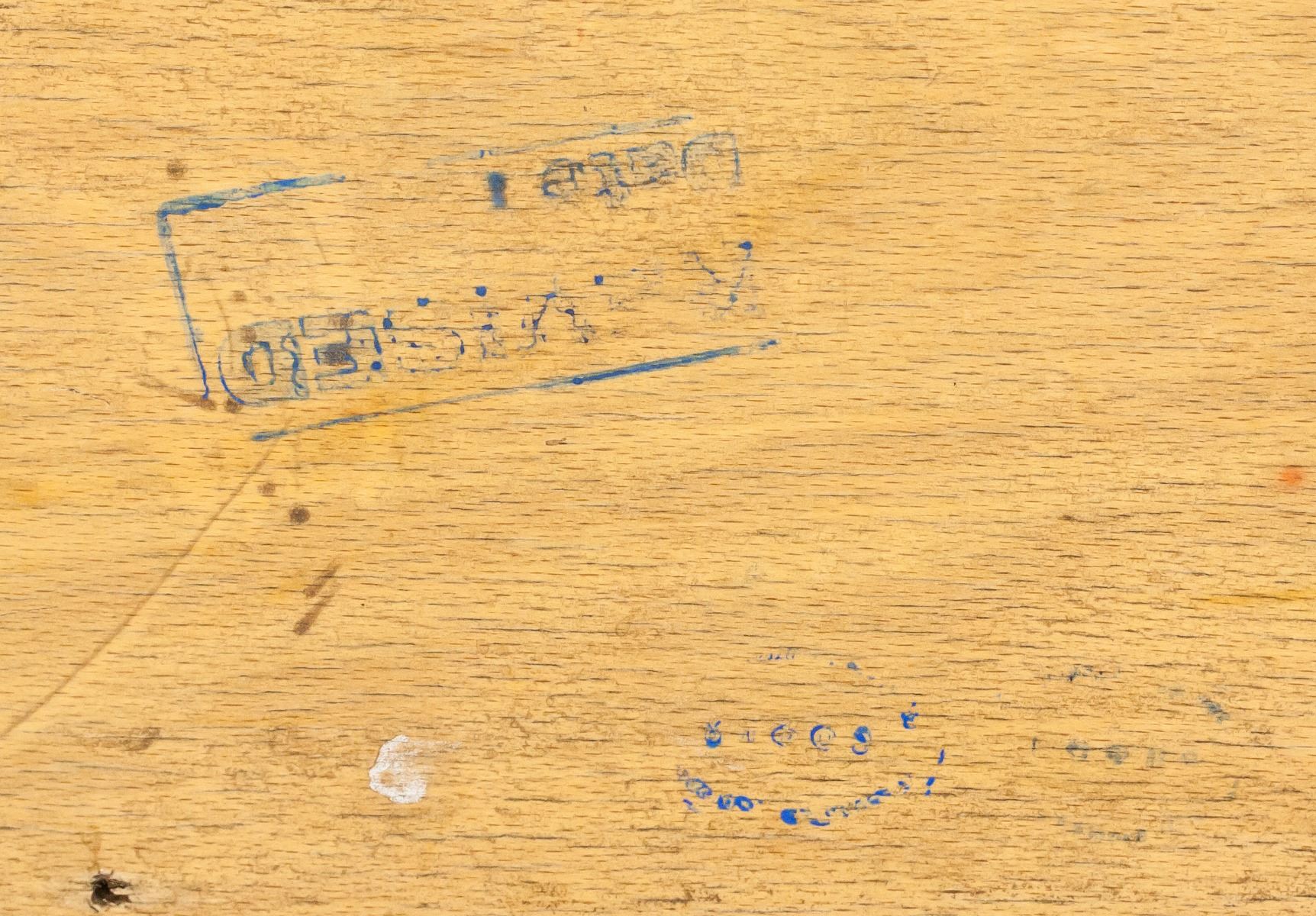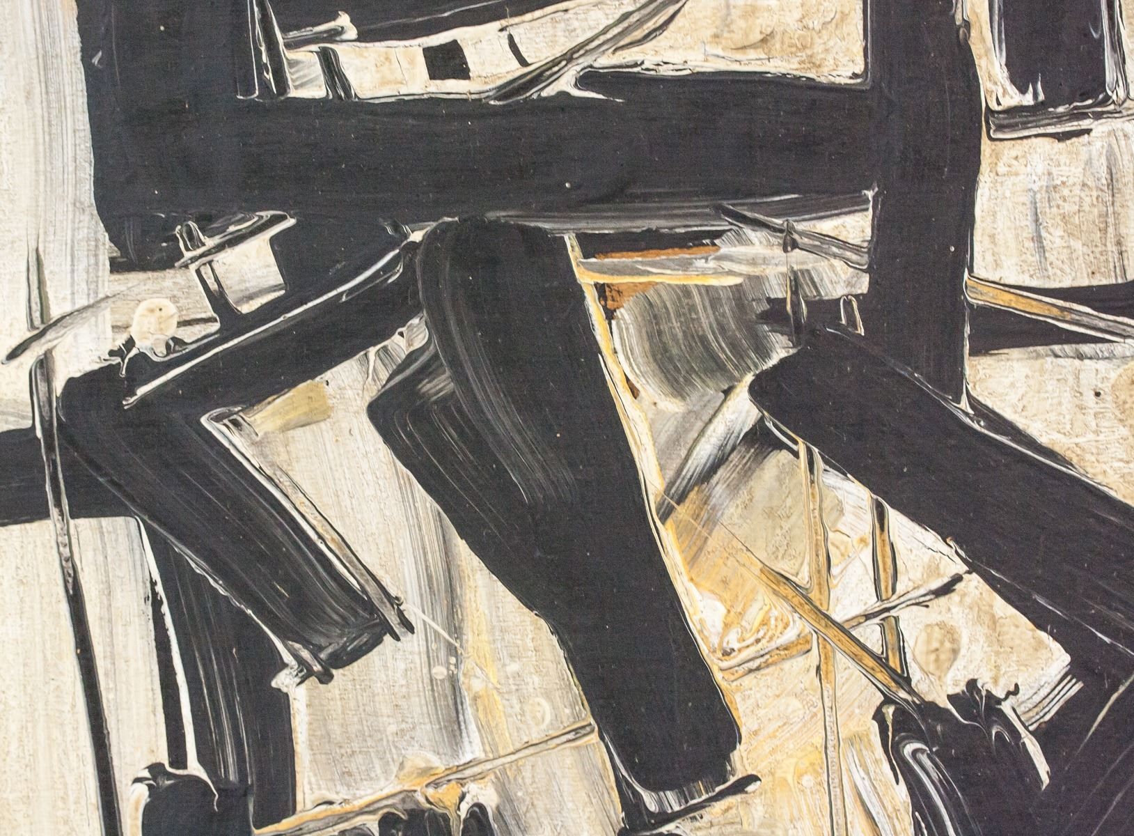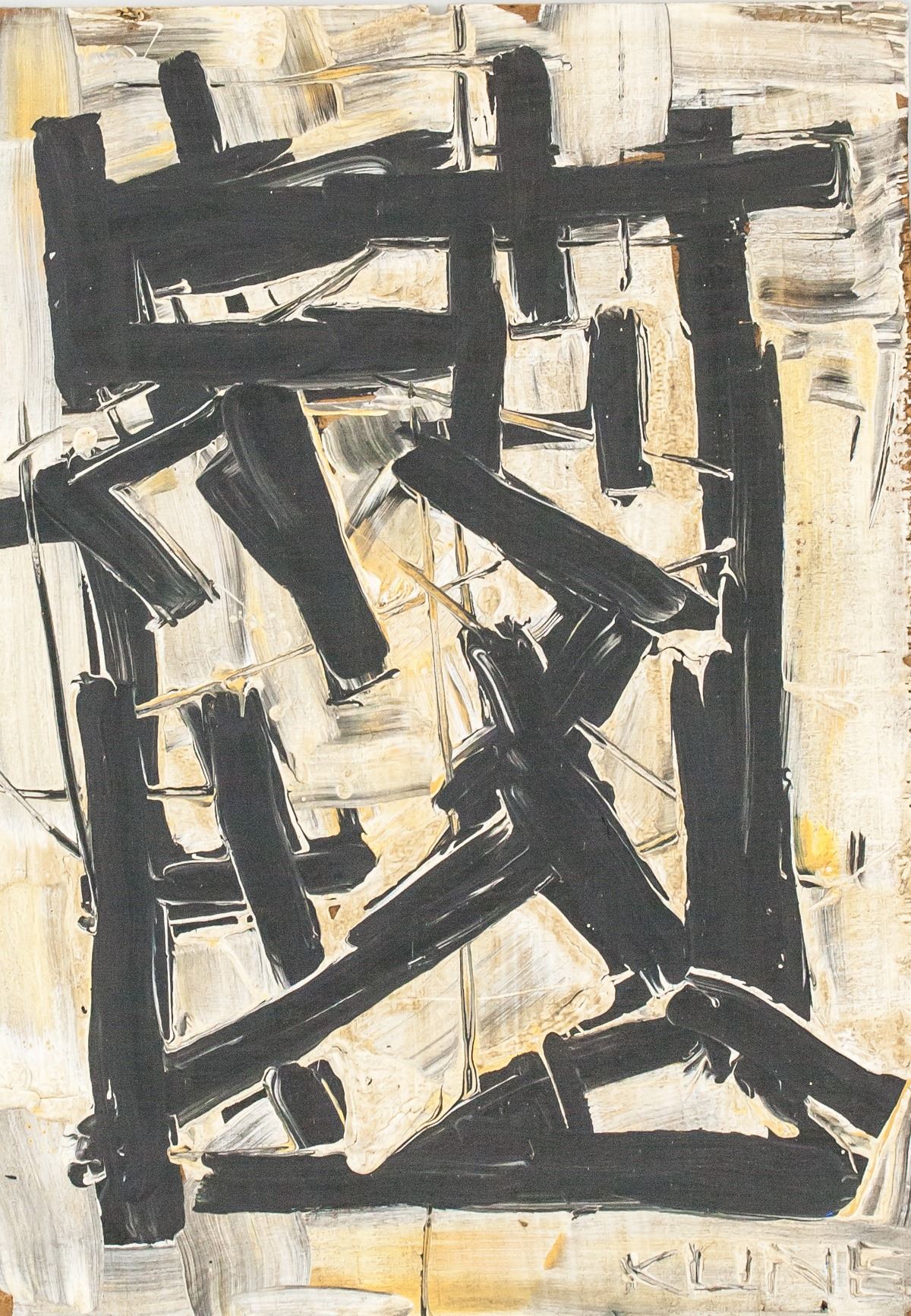 Mixed media on board. Featuring abstract compositino of thick black lines. Signed "KLINE" in the bottom right corner. Stamped illegibly on verso. Attributed to Franz Kline (1910-1962, American). 59 x 42 cm (23.25 x 16.5 inches).