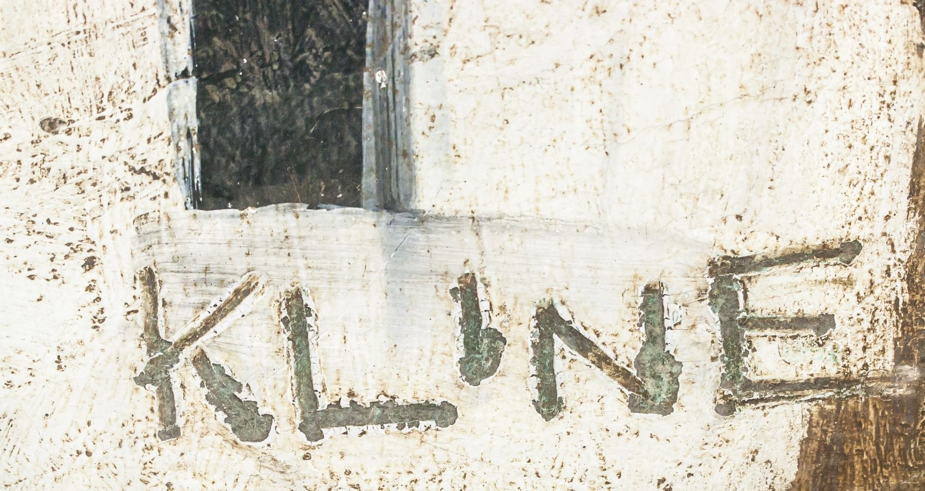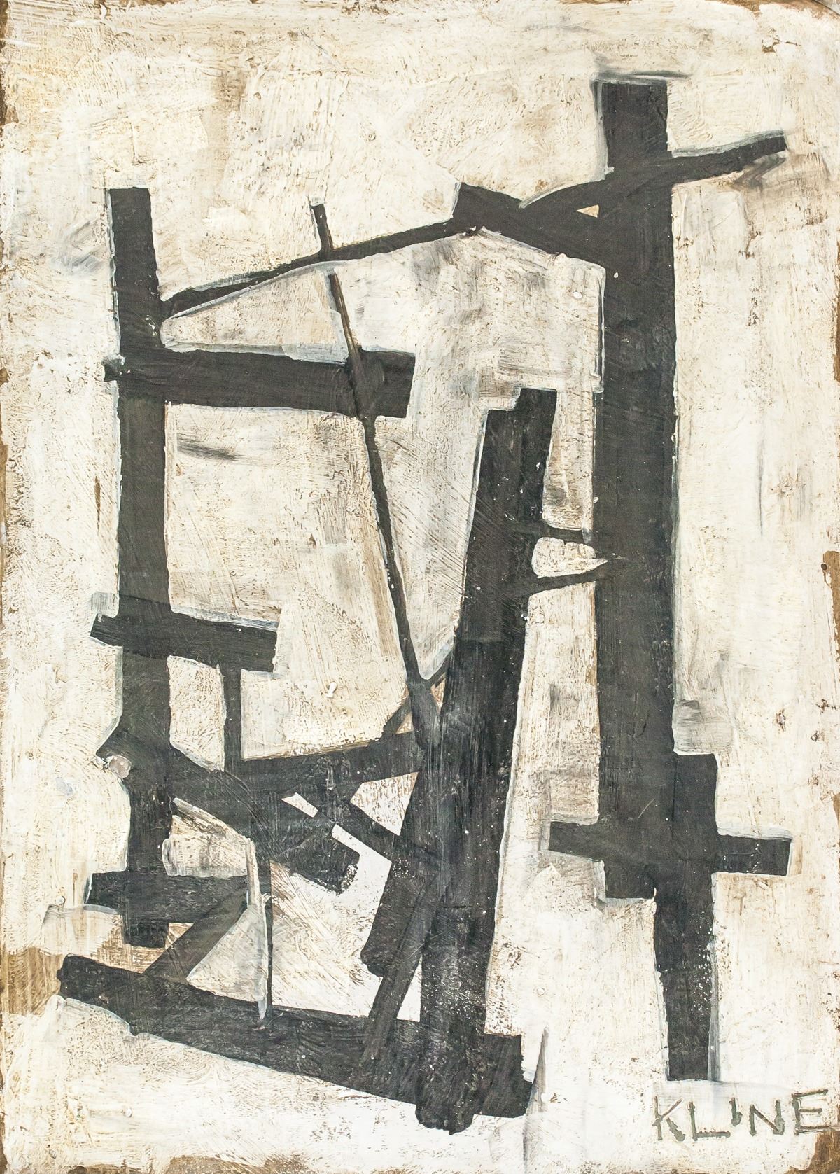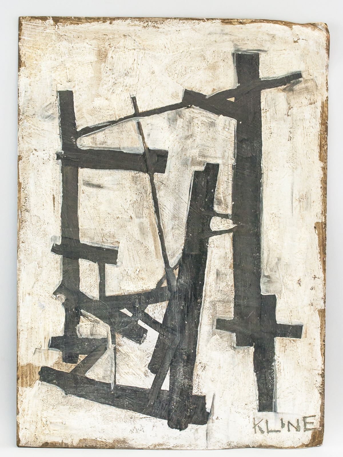 Oil on board. Featuring broad black lines in abstract expressionits composition. Signed KLINE on the lower right corner. Gallery label affixed to verso inscribed NORTH FOCUS ART HOUSE / Kenwood, London NW3. Attributed to Frank Kline (1910-1962, American). 70 x 50 cm (27.25 x 19.5 inches). Provenance: This lot carries limited provenance from an Italian estate