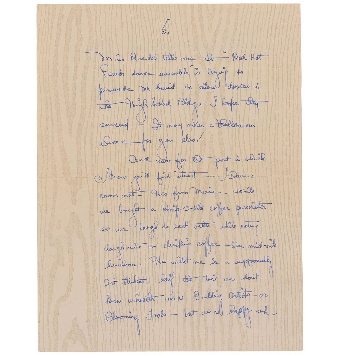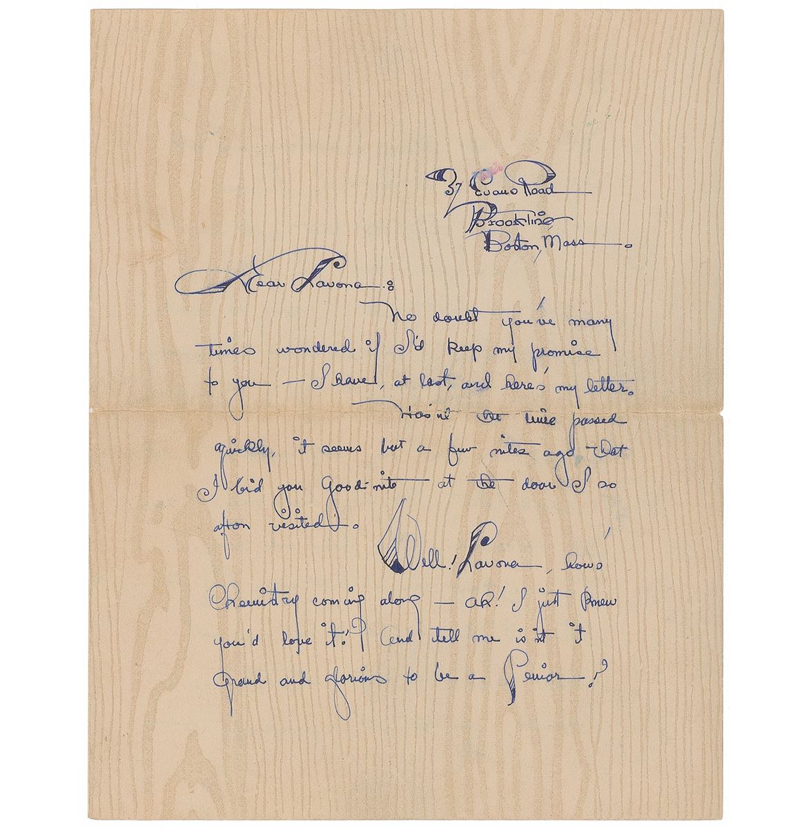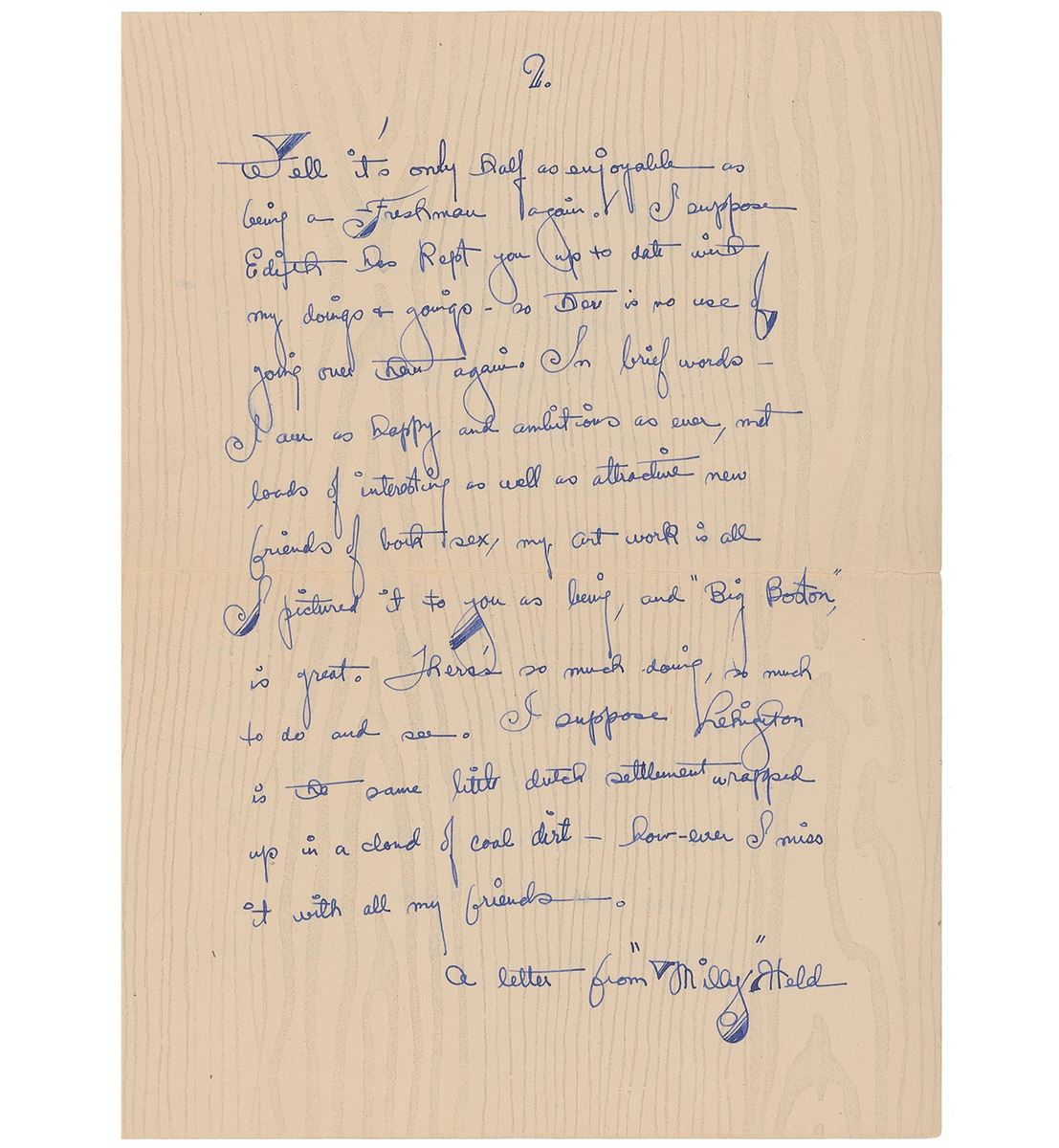 Notable American abstract expressionist painter (1910–1962). ALS signed “Franz,” three pages both sides, 6.25 x 8, October 25, 1931. Letter to Lavona Edgar about his life at Boston University. In part: “I have a roommate. He's from Maine. Tonight we bought a Drip-o-Lite coffee percolator, so we laugh to each other while eating doughnuts & drinking coffee. Our mid-nite luncheon. He with me is a supposedly art student, half the time we don't know whether we're Budding Artists, or Blooming Fools, but we're happy and get along fine together.” A tear to the edge of the first page, otherwise fine condition. Accompanied by the original mailing envelope addressed in his own hand, a 1931 commencement program from Leighton High School with Kline’s name listed, and a 1929 Leighton High School football schedule.