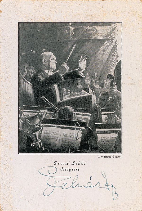 Popular Austrian composer (1870–1948) of ‘light’ classical music, best known for his operetta, ‘The Merry Widow.’ Vintage 4 x 6 postcard photo of an artist’s rendition of Lehar conducting an orchestra, signed in the lower border in blue ink. Scattered light toning and foxing to borders, a few light bends and creases, and an address label affixed to reverse, otherwise fine condition.