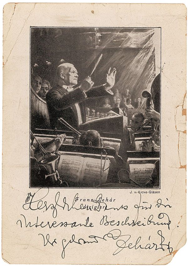 Popular Austrian composer (1870–1948) of ‘light’ classical music, best known for his operetta, ‘The Merry Widow.’ Vintage 4.25 x 6 postcard photo of an artist’s image of Lehar conducting, signed and inscribed in fountain pen in German to columnist S. Jay Kaufman thanking him for an interesting review. In good condition, with scattered moderate creasing, some affecting end of signature, light soiling and wrinkles, and mounting remnants to reverse.