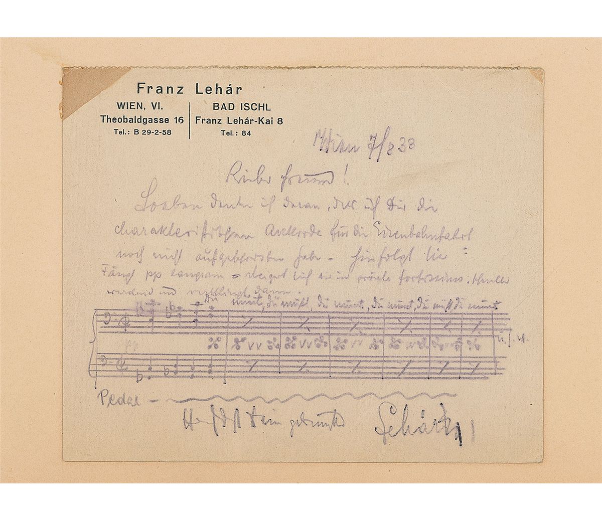 ALS in pencil in German, one page, 5.75 x 4.75, personal letterhead, August 7, 1933. A brief letter including an eight-bar AMQS for piano on two staves. In part (translated): “Just now I think that I have written you are not the characteristic chords for the train trip. Here it follows.” Lehar pens the musical quote at the conclusion. Affixed to a slightly larger sheet. Scattered creases and stains to upper corners, otherwise fine condition.