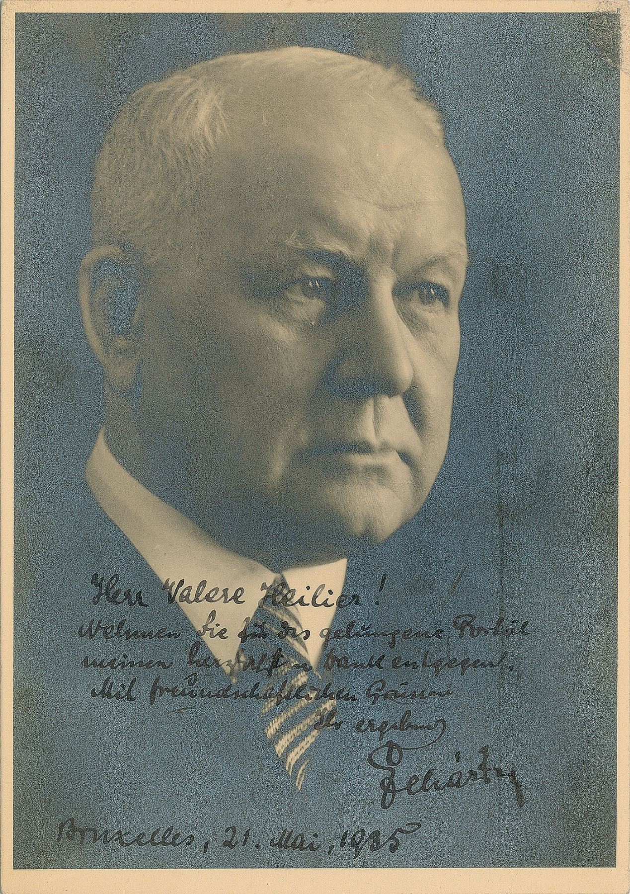 Matte-finish 4.75 x 6.75 photo of Lehar in a handsome suit and tie, neatly signed and inscribed in fountain pen in German, and dated May 21, 1935. In very good condition, with moderate overall silvering and a stain to the upper right corner tip.