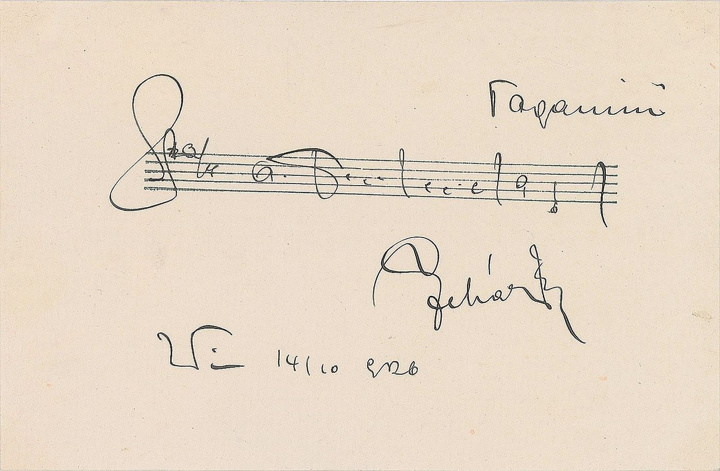 AMQS on an off-white 6 x 4 sheet, signed below in fountain pen, "Lehar, Wien, 14/10, 926," who pens three bars of music from his operetta "Paganini." In fine condition.