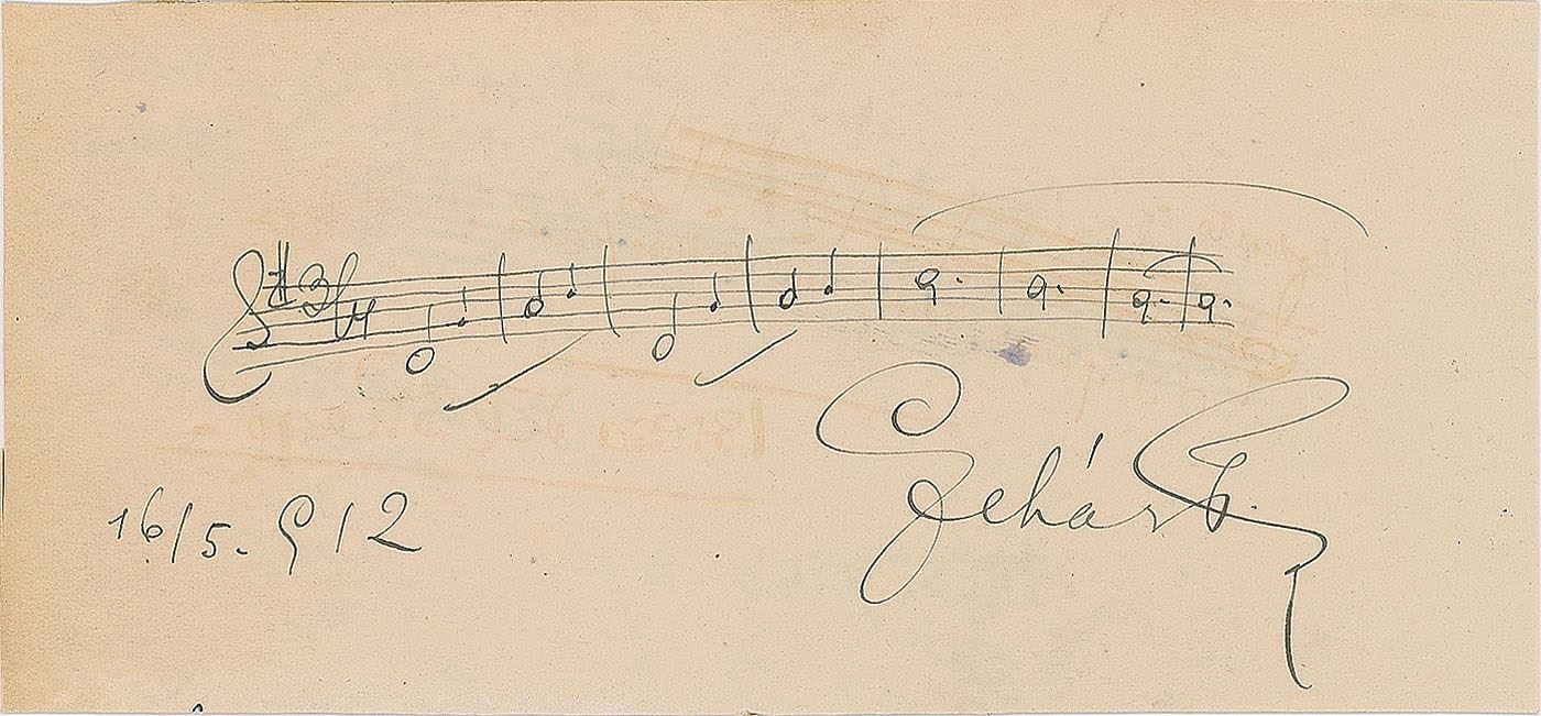 Austro-Hungarian composer (1870–1948) best known for his operettas. AMQS on an off-white 7.25 x 3.5 sheet, signed below and dated May 16, 1912. Lehar neatly pens eight bars of music from one of his works. Affixed to a same-size card and in fine condition, with faint offsetting from another musical snippet.