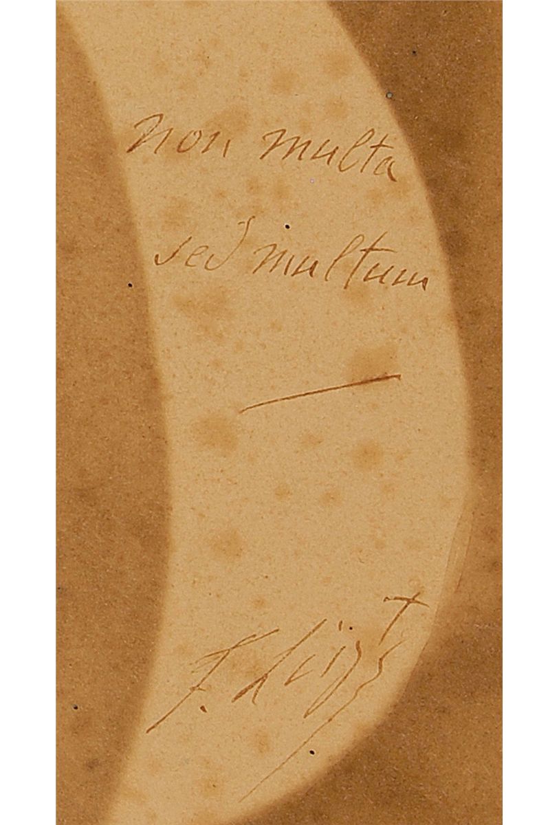 Hungarian Romantic era composer and pianist (1811–1886) whose prowess at the keyboard earned him the reputation as one of greatest virtuosos in the history of the instrument. Original vintage sepia 21.25 x 27 oval portrait of Liszt with his arms folded, signed in black ink, “Non Multa Sed Multum, F. Liszt.” The Latin quote translates to “Not many but much.” In very good condition, with light overall spotting to image and background, a bit lightly affecting the signature, several edge creases and bends, some scattered light surface loss, and some touched up areas to hair and facial area. Without a doubt the largest Liszt portrait we have ever seen, let alone offered.