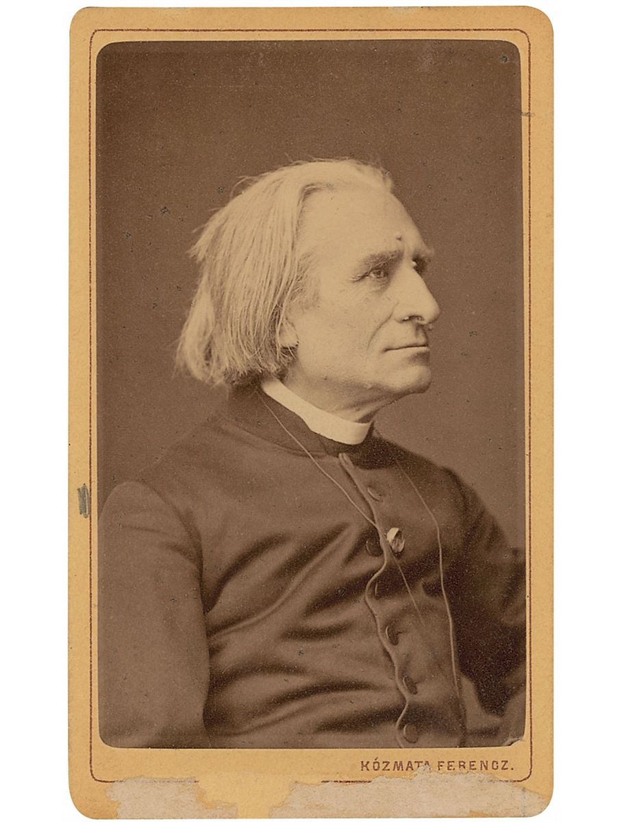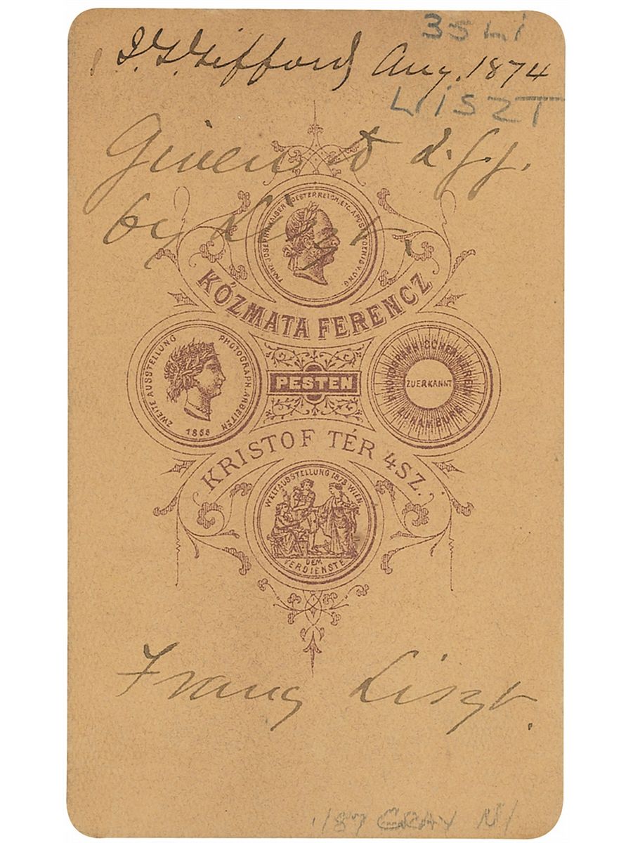 Original albumen carte-de-visite portrait of composer Franz Liszt with photographer's stamp to front and back. Paper loss to the bottom of the front, mark on front left, writing on back and general wear. Sharp and clear image.