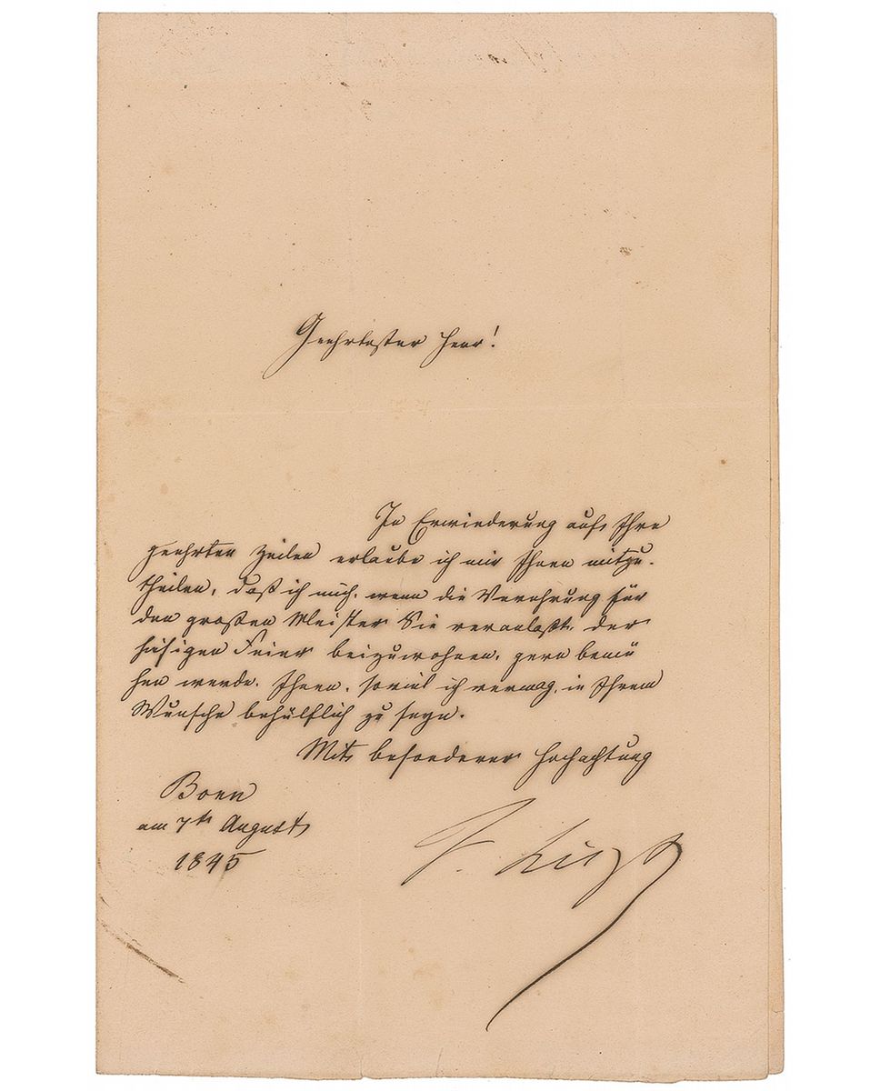 LS in German, signed “F. Liszt,” one page, 5.25 x 8.25, August 7, 1845. Untranslated letter to the Austrian tenor and later producer at the Vienna Court Opera, Ludwig Cramolini about the unveiling of the Beethoven Memorial at Bonn and the Beethoven festival there. In fine condition, with intersecting folds and slight haloing to ink. Just five days after this letter, on August 12, 1845, a large bronze statue of Beethoven was unveiled in Bonn, his birthplace, to honor the 75th anniversary of his birth. Just eight years after the composer's death, August Wilhelm Schlegel helped to organize the Bonn Association for the Beethoven Monument, calling for a permanent monument to be erected in the town square. Although it was enthusiastically embraced at an ideological level, fundraising attempts faltered and the project nearly went extinct before Liszt intervened in 1839, personally donating 10,000 francs to the fund. With Liszt's advocacy, the project began to materialize and—after a long five years—a three-day Beethoven Festival was organized in Bonn, the highlight being the official unveiling of the monument. Liszt had also financed the construction of the venue for the event, which was attended by the likes of Queen Victoria, Hector Berlioz, and Jenny Lind. With Liszt working to cement the Beethoven's legacy in the town square, this is a truly remarkable letter associating two of classical music's greatest figures.