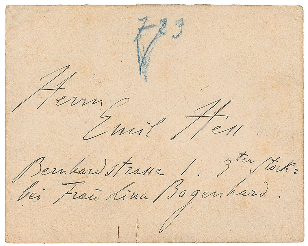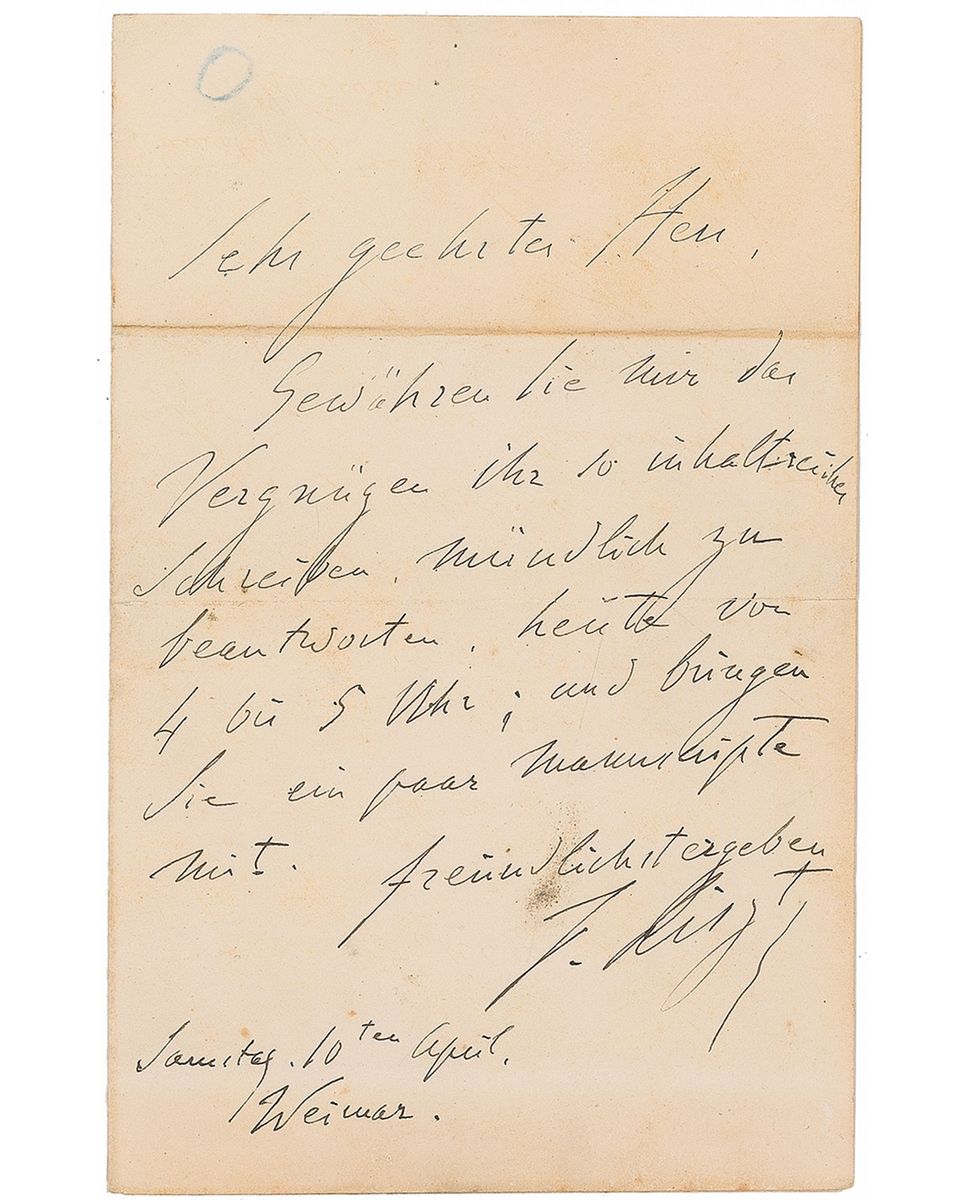 Romantic era composer and pianist (1811–1886) whose prowess at the keyboard earned him a cachet as perhaps the greatest virtuoso in the history of the instrument. Untranslated ALS in German, signed “F. Liszt,” one page, 4.5 x 7, April 10, no year. Light toning and soiling, and a small edge separation to one mailing fold, otherwise fine condition. Accompanied by the original mailing envelope, addressed in Liszt’s hand.