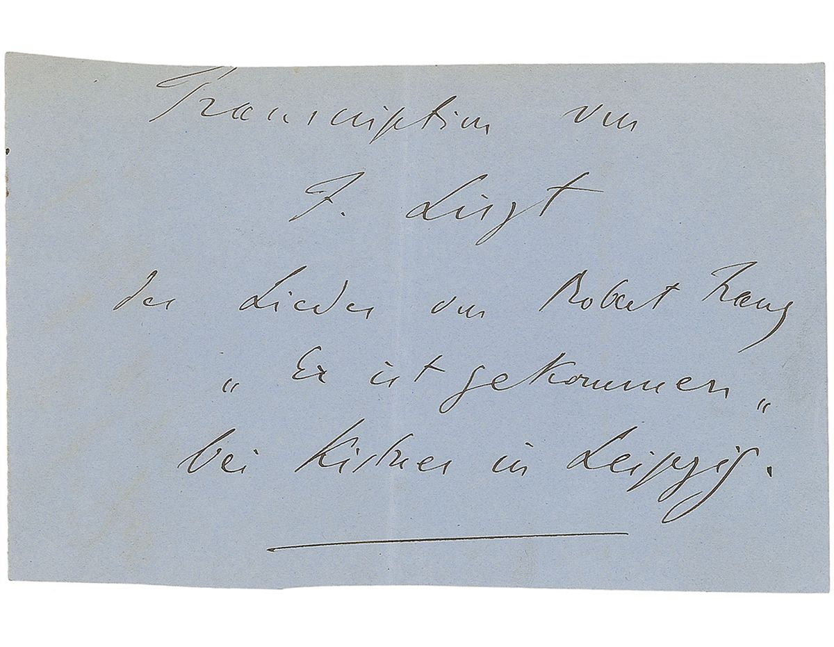 Third-person ANS in German, one page, 5.25 x 3.25, docketed on the reverse March 12, 1855. In full (translated): “Transcription by F. Liszt the songs of Robert Franz, ‘He is come’ by Kistner in Leipzig." In fine condition, with a central vertical fold and irregularly trimmed edges (affecting just the top of the very first letter).