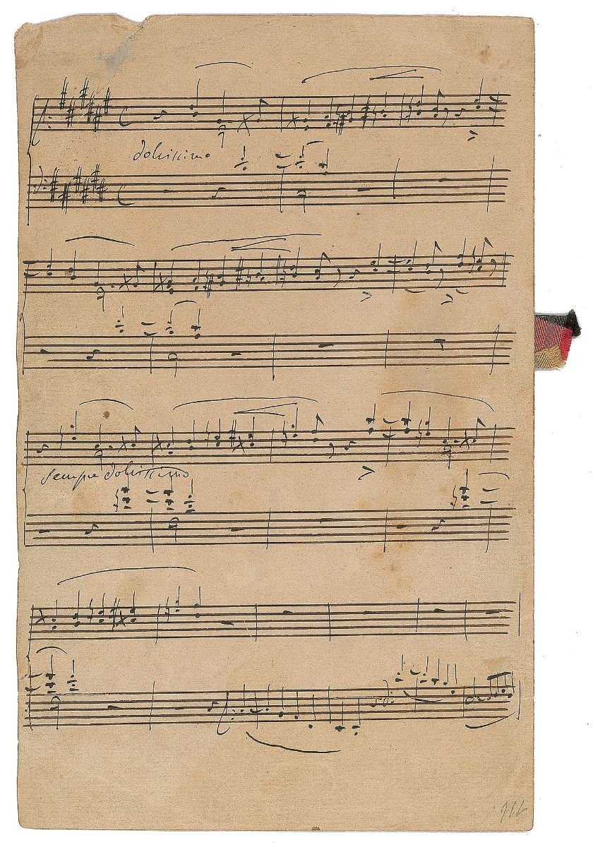 Astounding AMQS on both sides of an off-white 4 x 6.25 sheet, signed on the reverse in ink, “F. Liszt, April 58.” Liszt has transcribed bars 287–293, 302–307 (first half), and 344–352 (second half) from the first movement of the Dante Symphony. The front side features 17 measures on four systems, with mentions of “dolcissimo” and “sempre dolcissimo”; Liszt pens the concluding four measures on the reverse, which bears an affixed German ribbon and snippet of grass. In very good condition, with soiling and light staining, and an upper corner crease. Accompanied by an unsigned postcard photo of Liszt. Based on the Italian epic The Divine Comedy, Liszt’s Dante Symphony premiered in Dresden in November 1857. Written in the high romantic style, the two-movement masterpiece was unofficially dedicated to his friend and future son-in-law Richard Wagner. An atypically lengthy and intricate composition, and only the fourth Liszt AMQS we have offered.