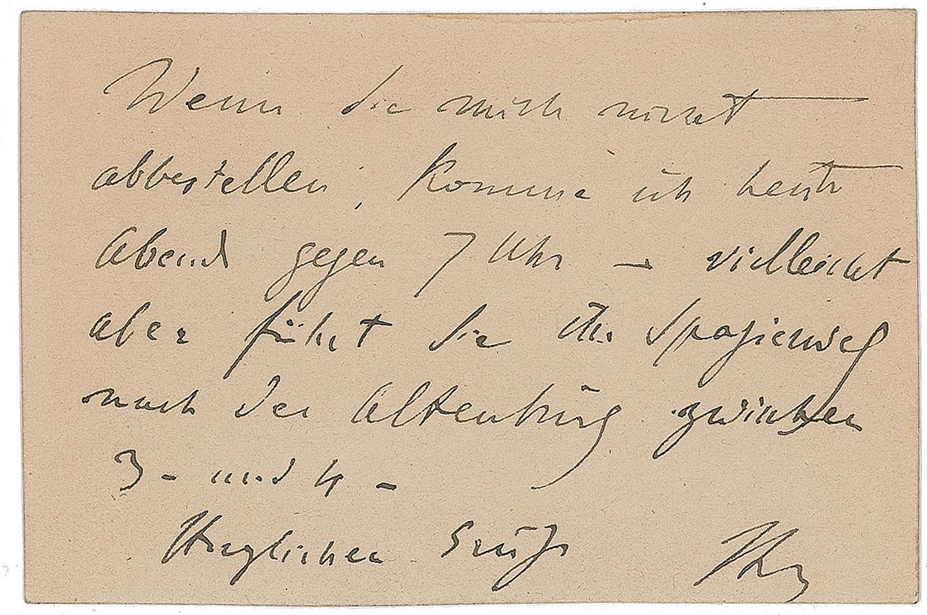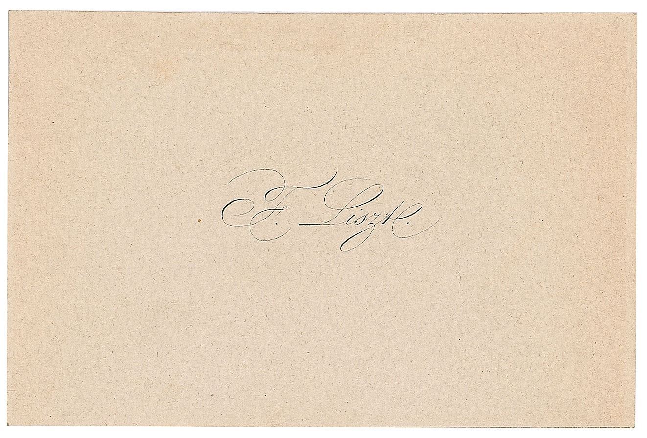 Scarce untranslated ANS in German, signed “F. Lz.,” one page on the reverse of a 4.25 x 2.75 visiting card marked "F. Liszt," no date. In very fine condition.