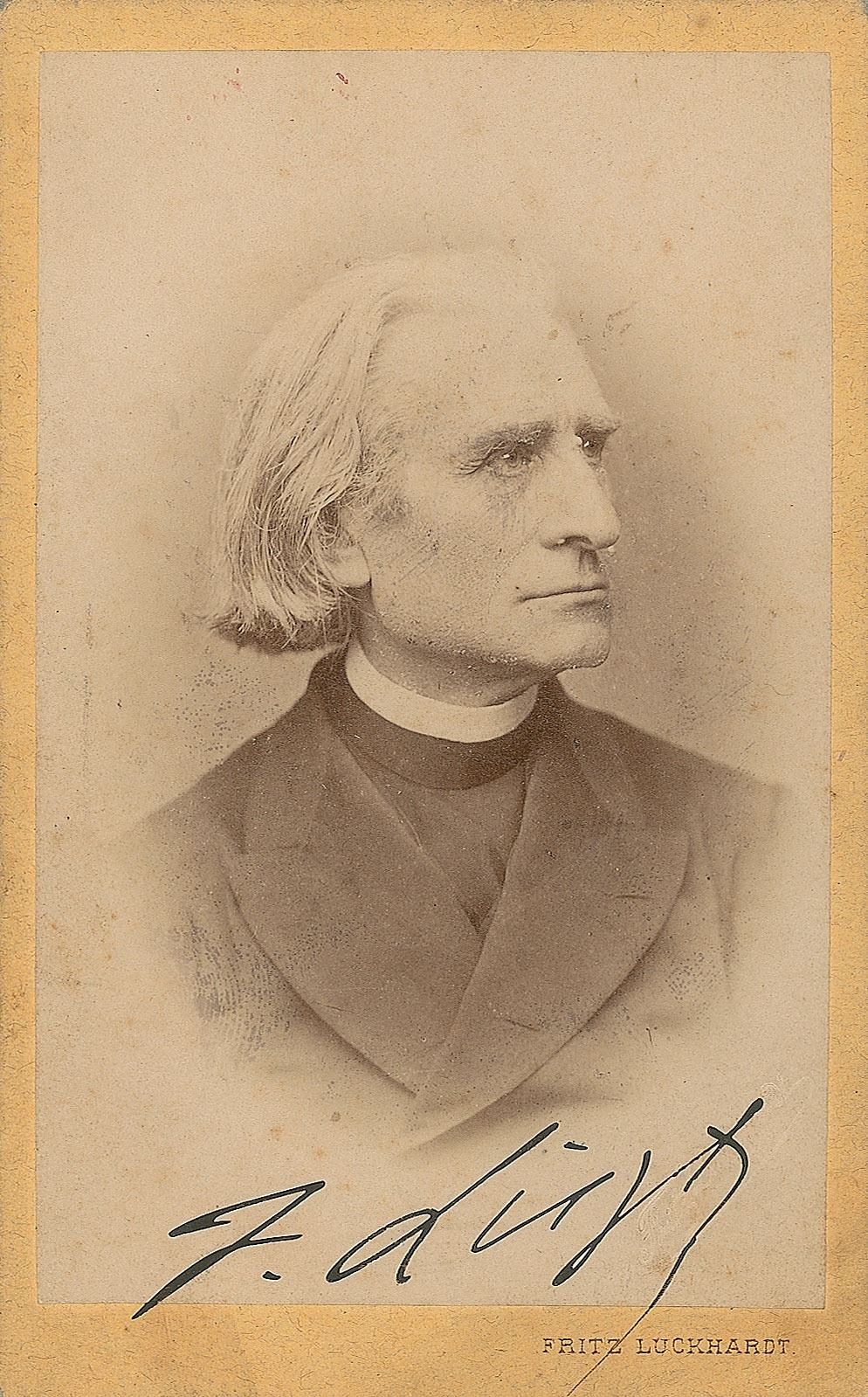 Scarce 2.5 x 4 carte-de-visite photo of Liszt by Fritz Luckhardt of Vienna, boldly signed in ink, "F. Liszt." In fine condition, with a light stain to the bottom border.