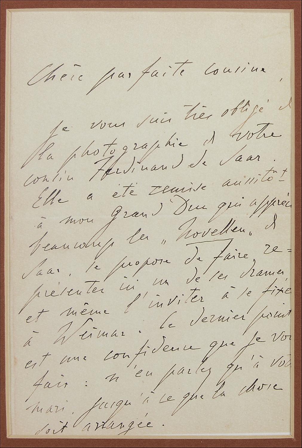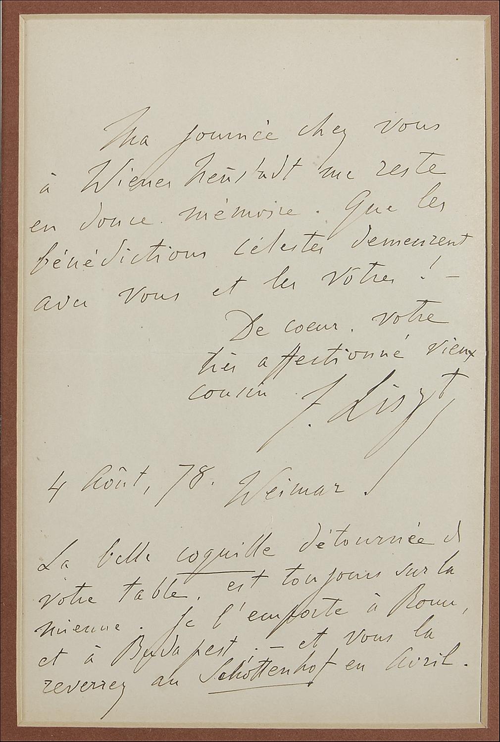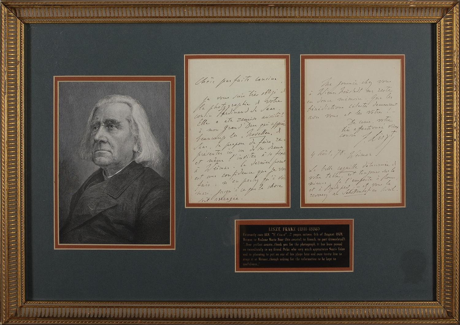Rare ALS in French, signed “F. Liszt,” two pages, 4.5 x 7, August 4, 1878. A letter to Madame Marie Saar (his cousin). In part (translated): “Thank you for the photograph. It has been passed on immediately to my Grand Duke, who very much appreciates Saar’s Tales and is planning to put on one of his plays here and even invite him to stage it at Weimar though asking for the information to be kept in confidence.” Attractively double matted and framed with an engraving and a small plaque to an overall size of 20.75 x 14.75 In fine condition, with mild toning to letter’s edges.
