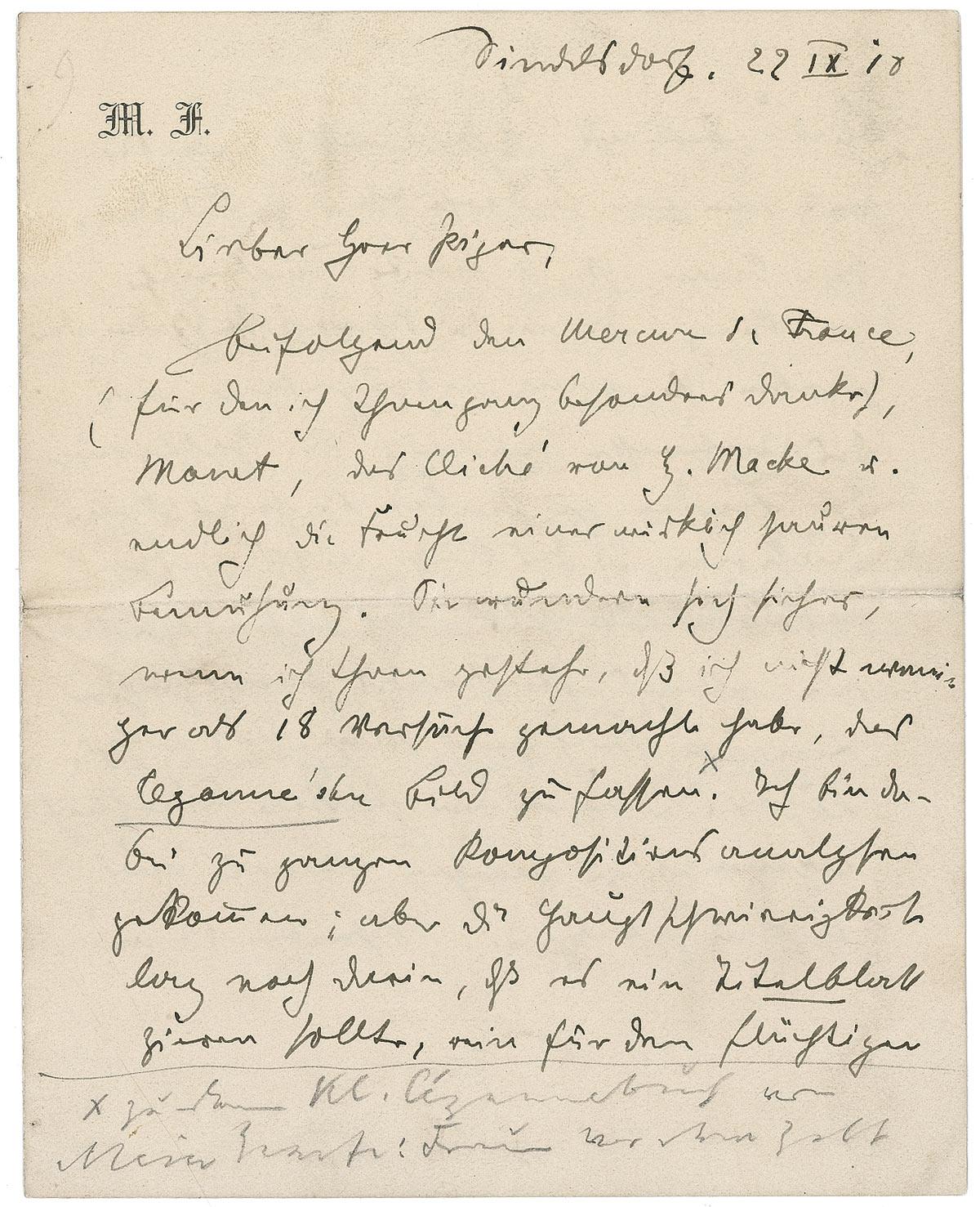 German painter (1880–1916) who was one of the principal figures of the Expressionist movement. Though he was among several notable artists whose names were on a list to be withdrawn from combat during World War I, he was killed by a grenade at the Battle of Verdun before the order could be carried out. Scarce ALS in German, signed “F. Marc,” three pages on two adjoining sheets, 5.75 x 7.25, personal letterhead, September 22, 1910. Letter to Munich publisher Reinhard Piper. In part: “I include the Mercure de France (for which I thank you especially), Monet, G. Macke’s cliché, and finally the fruit of his truly terrible labours. You will surely be amazed to hear that I made no less than 18 different attempts to present the Cezanne. I developed entire analyses of composition, but the main difficulty was that the image was intended to grace a title page, for a mere ‘fleeting’ glance – I hope you are satisfied with my final result. It aims to entirely give up all elements of painting so hard to capture in black and white and to focus the viewer’s attention on the group of women in the tent and to condense it so well that the eye desires nothing else. – I finally decided on a rather flowing kind of Japanese paper, so as to dissolve the brush line as well as possible. For I could hardly succeed in…producing an even brush line. Let me know if you agree and are satisfied; I dearly hope you are. – The weather is quite horrid; the mountains are covered with snow almost down to the foot. We must heat as in winter. – Thannhausen has forwarded my manuscript to the Society; the gentlemen wish to publish it in several periodicals.” According to a penciled note along the bottom of the first page, the illustration was intended for Meier-Graefe’s little Cézanne book.Published in: Briefwechsel mit Autoren und Künstlern: 1903–1953. In fine condition, with mild light toning, a bit of scattered soiling, mostly confined to first page, and a bisecting mailing fold. RRAuction COA.