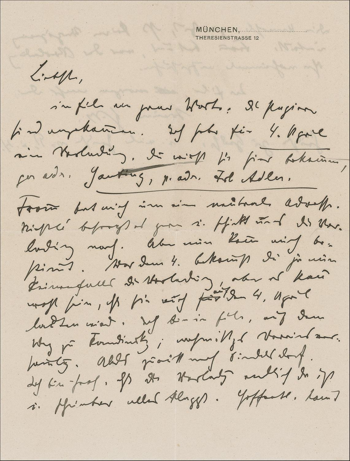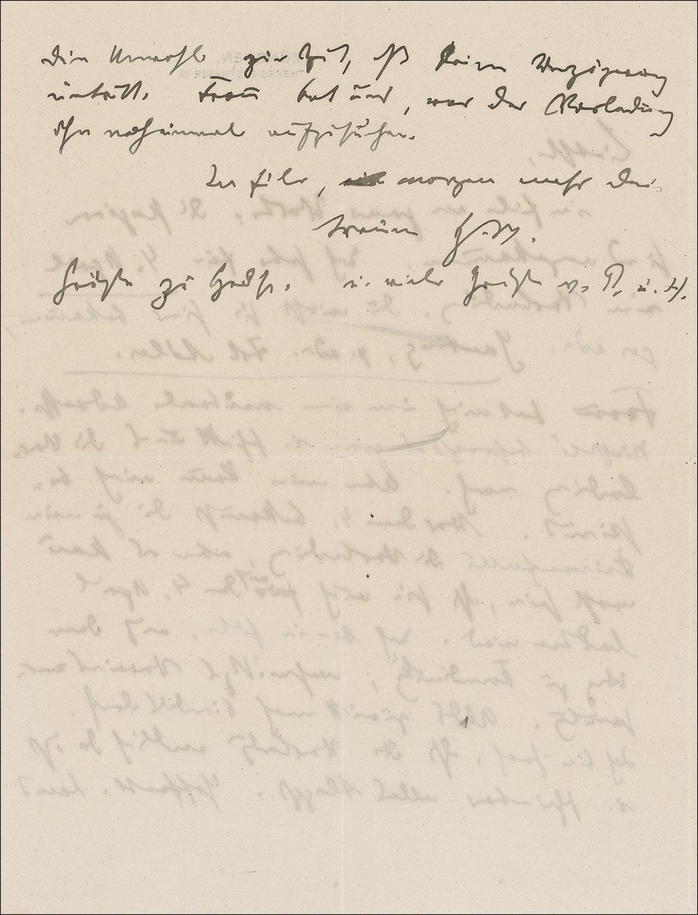 German painter (1880–1916) who was one of the principal figures of the Expressionist movement. Though he was among several notable artists whose names were on a list to be withdrawn from combat during World War I, he was killed by a grenade at the Battle of Verdun before the order could be carried out. ALS in German, signed “F. M.,” one page both sides, 7.5 x 10, personal letterhead, no date, but circa March 1911. Letter to his bride Maria Franck concerning a court summons (his first wife Marie, née Schnür, whom Marc had divorced in 1908, tried to sabotage his marriage to Maria Franck through an adultery charge). In part (translated): “The papers have arrived. I have been subpoenaed for the 4th of April. You will get it here, addressed to Gauting, c/o Miss Adler. Fromm requested me to provide a neutral address…I’m in a hurry, on my way to; there’s a meeting of the society this afternoon. Back to Sindelsdorf in the evening. I’m glad the summons has finally arrived and that everything seems to be working.” Central horizontal and vertical fold, a few wrinkles and creases, and writing lightly showing through from opposing sides, otherwise fine condition. Both Marc and Franck were summoned to appear before the Munich district court on April 4. The “meeting of the society” mentioned here probably refers to a session of the Neue Kunstlervereinigung Munchen—the Munich New Artist's Association—to which Marc had been elected third chairman in 1911...the same year as the revolutionary ‘Blaue Reiter’ exhibition in Munich. An optimistic letter from the artist who here expresses his desire to move forward with his life—something he eventually did with his second wife.