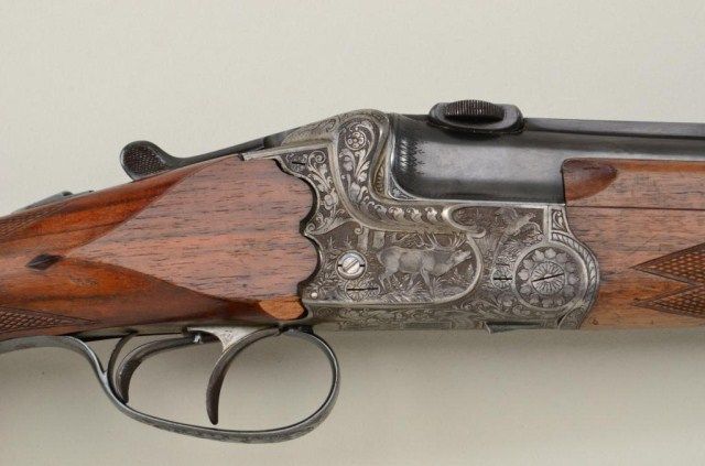 Franz Merkel Zella Mehlis addressed O/U combination rifle shotgun showing U.A./Z markings with eagle over “N” proofs., serial #7650. The barrels measure 24-1/2” and the top barrel is 16 gauge extra full over 8 x 57 R. The frame is nicely engraved with scrolls and game scenes and the barrels show mounts for claw type scope. The rifle barrel shows a set trigger and the frame shows cocking indicators. The stock is goodquality walnut with a cheek piece and measures14-1/4” to the end of the horn butt plate. The barrels retain 90-95% original blue and frame shows about 50% light gray original colors. There is some beginningrust. The trigger guard shows 85% blue, the gun locks tight and the bores are very good plus and may clean to excellent. The fore end is very good with sharp checkering but the butt stock is badly damaged and needsrestoration. The stock has pulled away from the frame and has cracked from poor and careless shipping. (Don’t believe the advertising). From the Robert E. Petersen Estate. Est.;$900-$1,800.