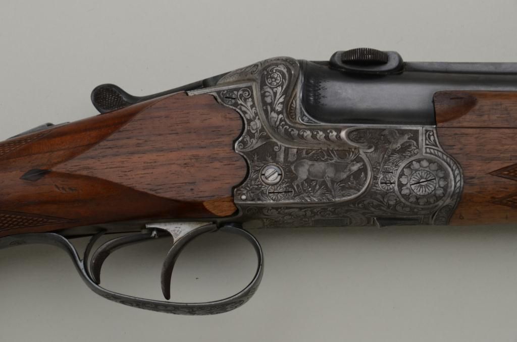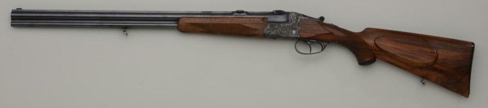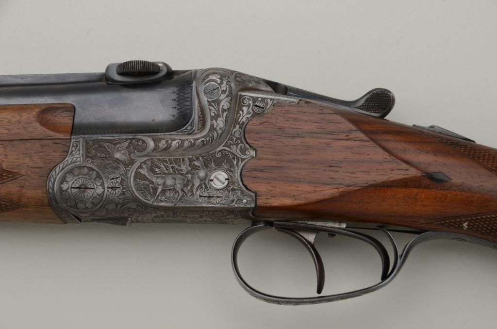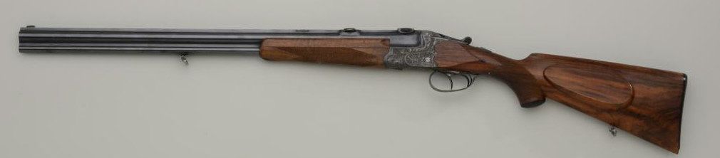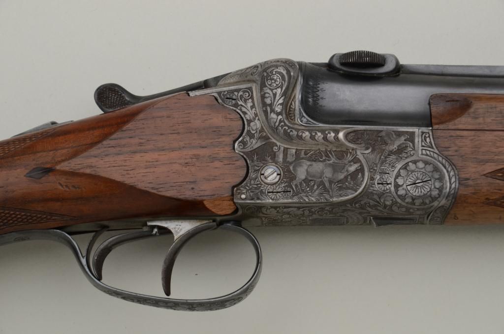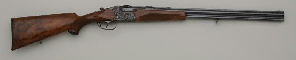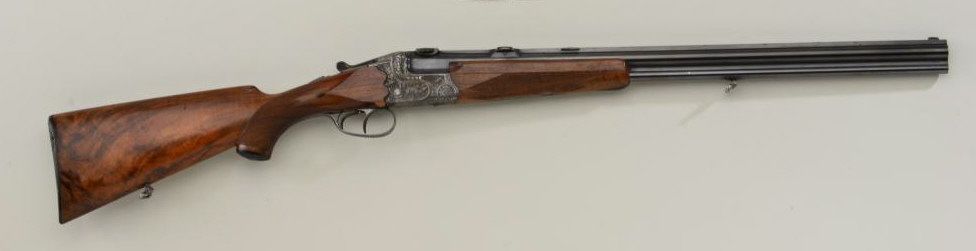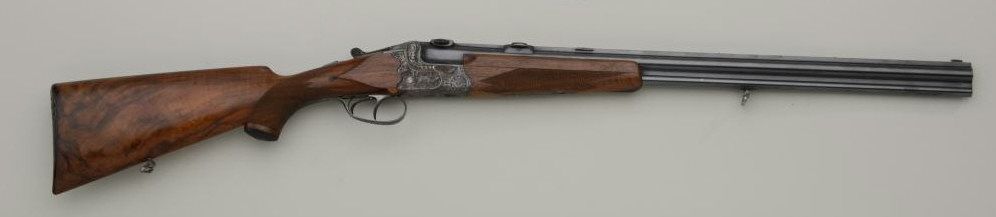 Franz Merkel Zella Mehlis addressed O/U combination rifle/shotgun showing U.A./Z markings with eagle over “N” proofs., serial #7650. The barrels measure 24-1/2” and the top barrel is 16 gauge extra full over 8 x 57 R. The frame is nicely engraved with scrolls and game scenes and the barrels show mounts for claw type scope. The rifle barrel shows a set trigger and the frame shows cocking indicators. The stock has beenbroken in transport and needs repair. Quality walnut with a cheek piece and measures14-1/4” to the end of the horn butt plate. The barrels retain 90-95% original blue and frame shows about 50% light grayoriginal colors. There is some beginning rust. The trigger guard shows 85% blue, the gun locks tight and the bores are very good plus and may clean to excellent. The fore end is very good with sharp checkering but thebutt stock is badly damaged and needs restoration. The stock has pulled away from the frame and has cracked from poor and careless shipping. (Don’t believe the advertising). From the Robert E. Petersen