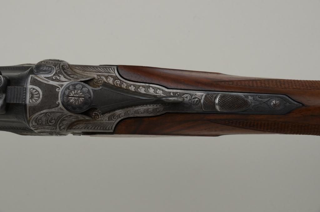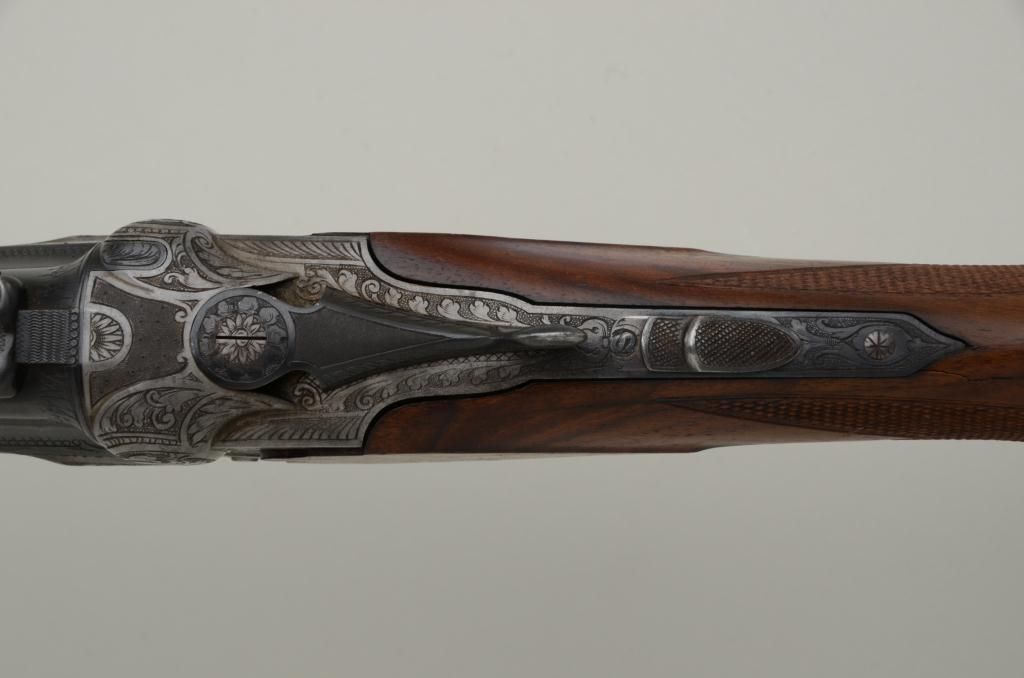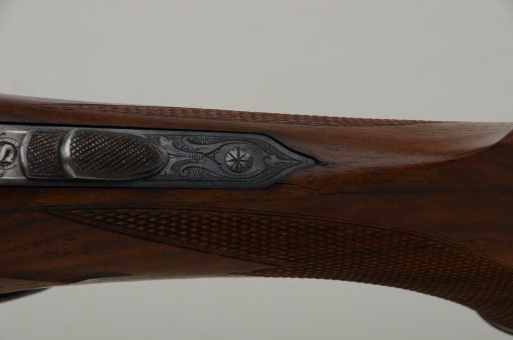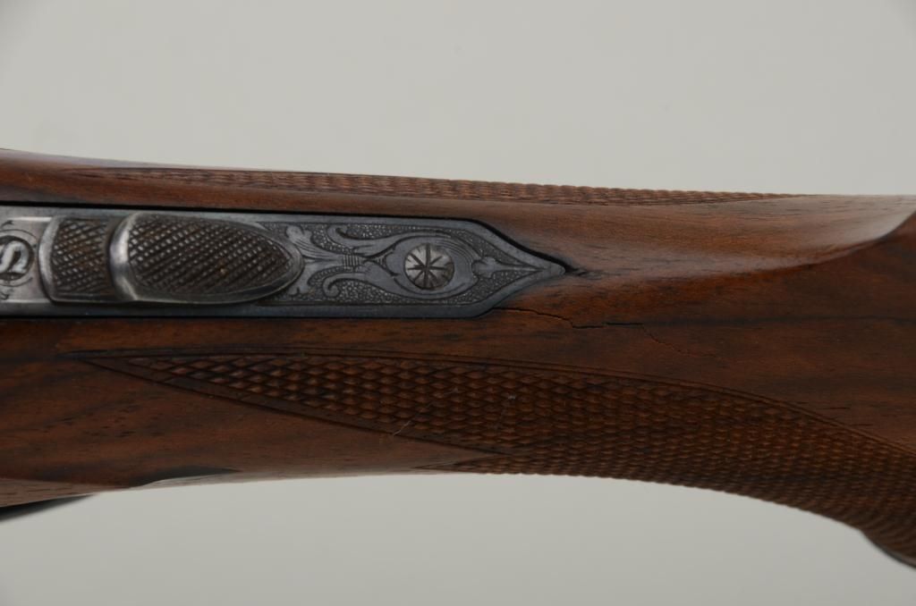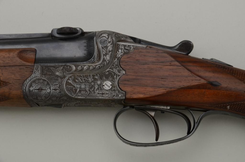 Franz Merkel Zella Mehlis addressed O/U combination rifle/shotgun showing U.A./Z markings with eagle over “N” proofs., serial #7650. The barrels measure 24-1/2” and the top barrel is 16 gauge extra full over 8 x 57 R. The frame is nicely engraved with scrolls and game scenes and the barrels show mounts for claw type scope. The rifle barrel shows a set trigger and the frame shows cocking indicators. The stock has beenbroken in transport and needs repair. Quality walnut with a cheek piece and measures14-1/4” to the end of the horn butt plate. The barrels retain 90-95% original blue and frame shows about 50% light grayoriginal colors. There is some beginning rust. The trigger guard shows 85% blue, the gun locks tight and the bores are very good plus and may clean to excellent. The fore end is very good with sharp checkering but thebutt stock is badly damaged and needs restoration. The stock has pulled away from the frame and has cracked from poor and careless shipping. (Don’t believe the advertising). From the Robert E. Petersen