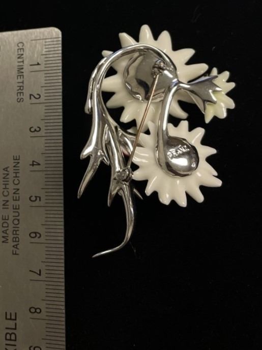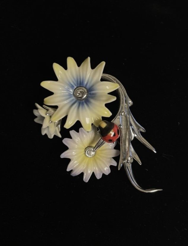 Franz Porcelain Brooch Rhodium Plated Sterling Silver Featuring Lady Bug and Daisies
