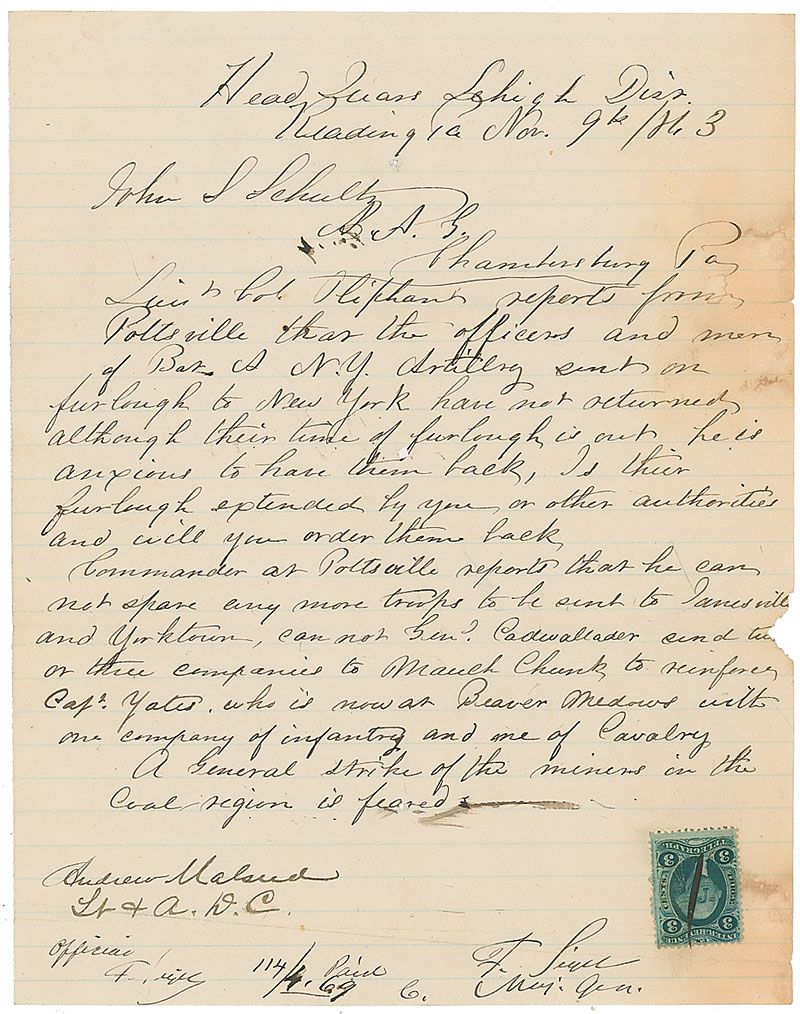 German military officer, revolutionist, and immigrant to the United States (1824–1902) who served as a Union major general. War-dated LS signed twice, “F. Sigel, Maj. Gen.,” and “Official, F. Sigel,” one page, lightly-lined, 7.75 x 9.75, November 9, 1863.