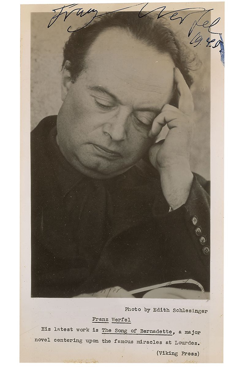 Austrian novelist, playwright, and poet (1890–1945). Vintage glossy 4.5 x 8 publicity photo for his then-upcoming novel The Song of Bernadette, signed in blue ink, “Franz Werfel 1940.” Slightly trimmed bottom edge, a brush to end of signature, and some light border toning, otherwise fine condition.
