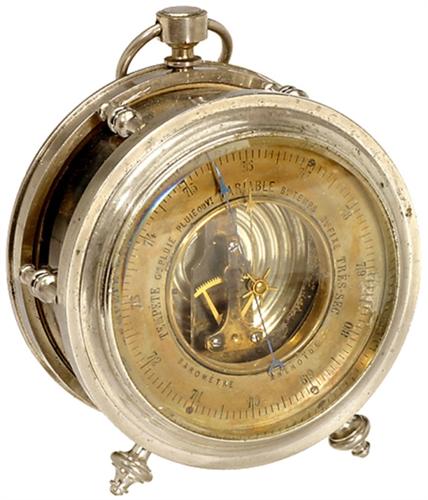 Französisches Barometer, um 1900 Unbezeichnetes Aneroid-Barometer, Weckerform, Ø 11 cm. Lünette und Rückwand durch kleine Säulen verbunden, Gehäuse aus Glas, Metallteile vernickelt. – Sehr dekoratives Sammlungsstück! French barometer Formed like an alarm clock, with glass case. – (2–3/2) – € 80/150 – (22/61)