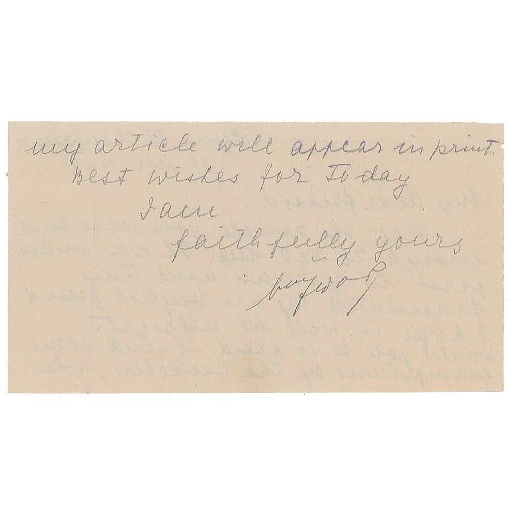 LS in pencil, one page both sides, 7.25 x 4, February 26, 1920. Letter to the publisher of a bulletin, in full: "Here there article you were kind enough to ask me. It was written first in German and then translated by an English friend. I hope it will be allright. Would you be so kind to send some exemplares of the Bulletin, when my article will appear in print." In fine condition.