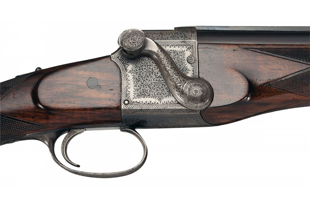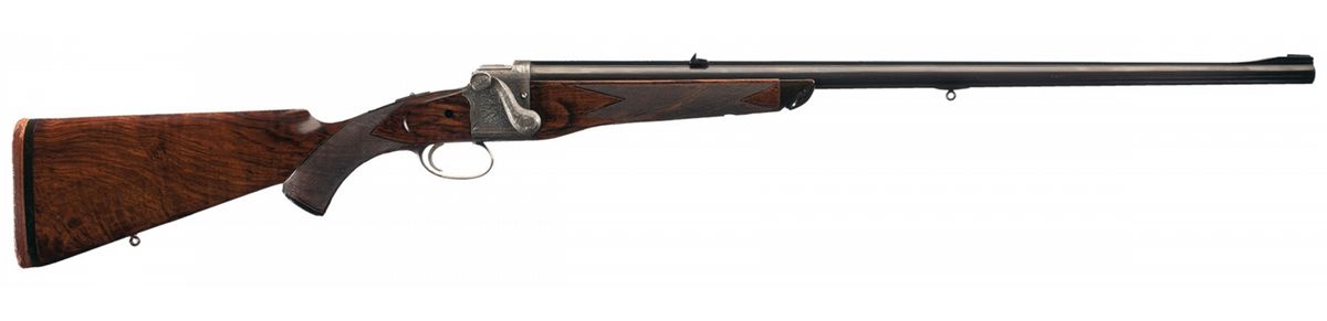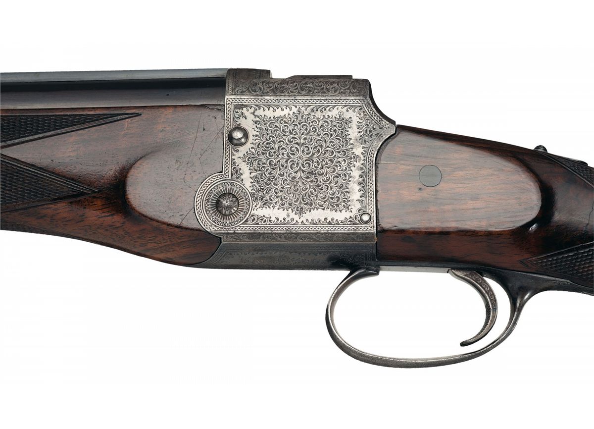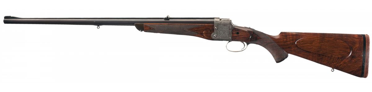 The top of the solid rib has the three line Fraser address, ramp blade front sight with provisions for a hood and two leaf rear sight (one fixed, one folding). The action features an extensive tight english scroll engraving with borders and the top of the receiver is marked "FRASER'S PATENT/No 218." Barrel is numbered to the gun. The rifle has an automatic tang safety with gold marked "SAFE." The scrollwork extends to the forearm hardware, breech lever and trigger guard. Nicely figured multi-point checkered pistol grip stock with cheekpiece, sling eyelets, horn forend tip, blank initial shield, horn grip cap and solid recoil pad.