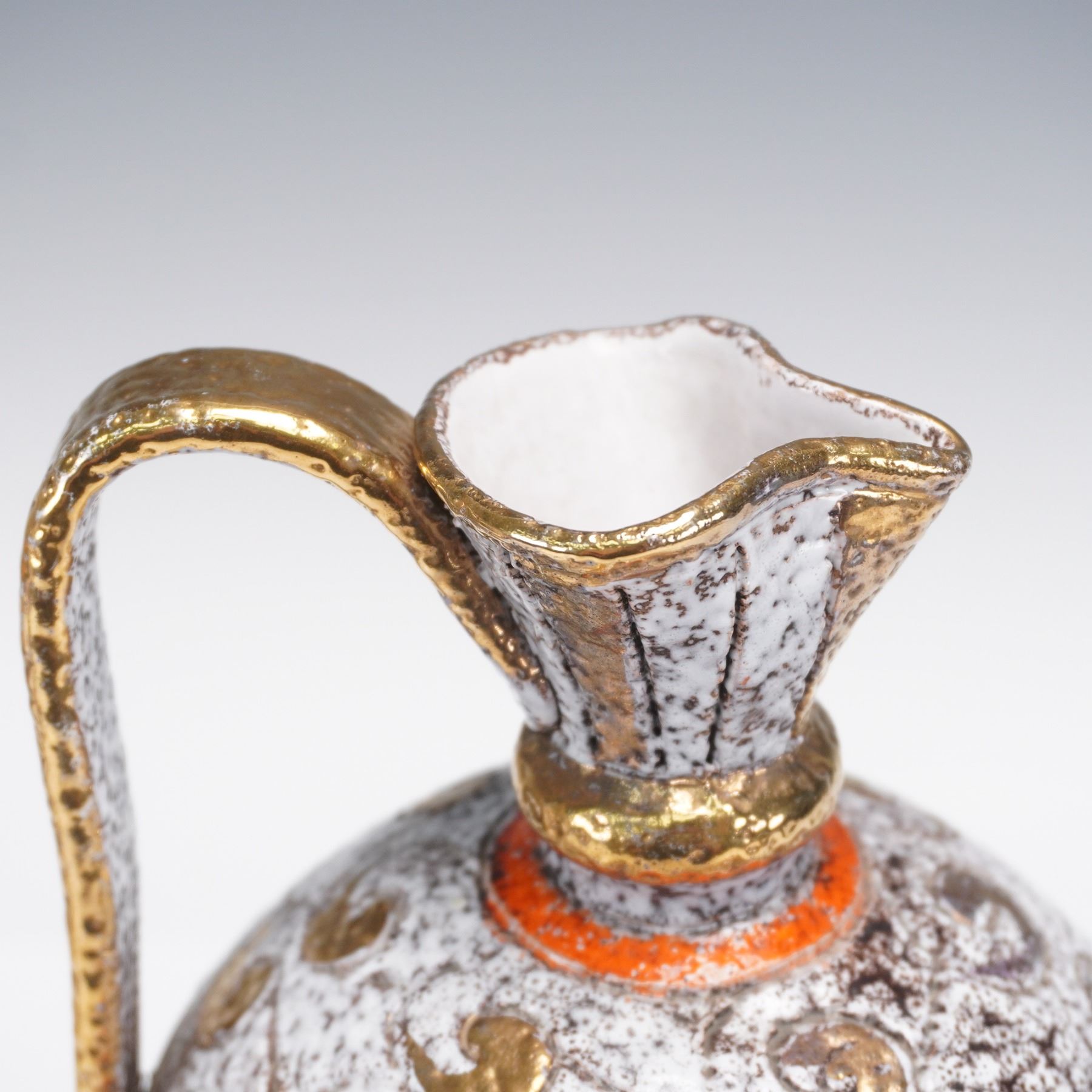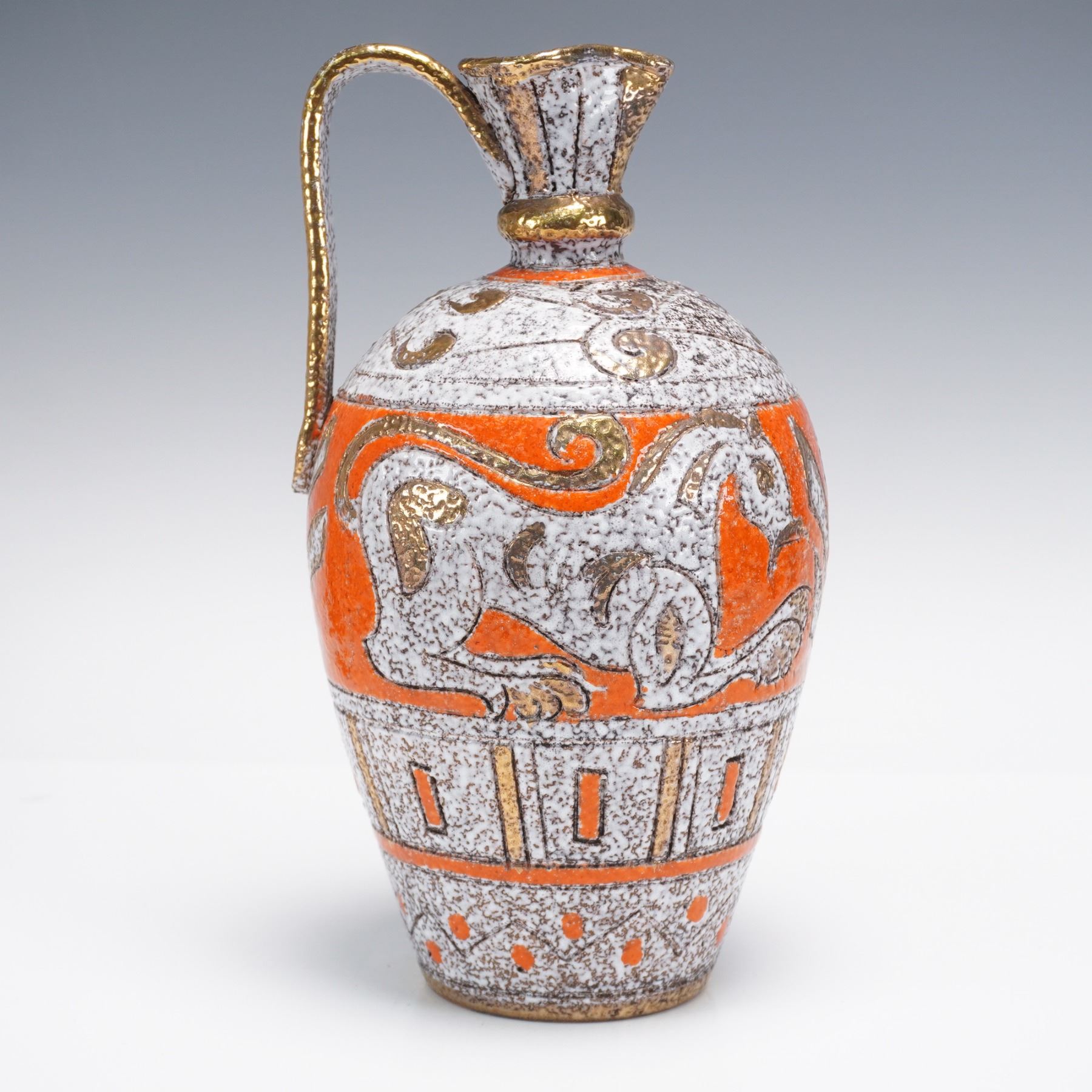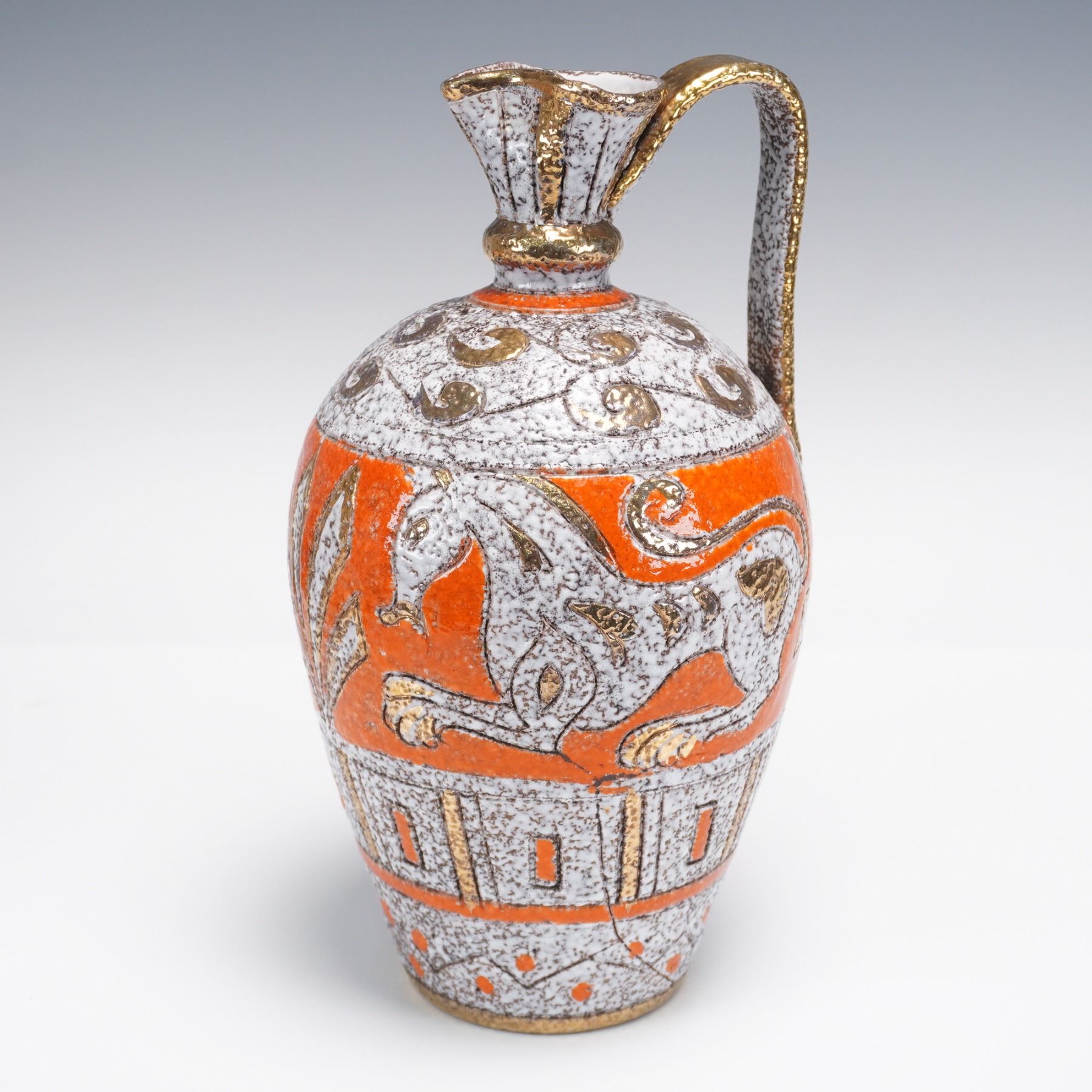 This Italian pottery pitcher by Fratelli Fanciullacci features a bold mythological horse motif in vivid orange glaze with speckled white texture and gilded accents. The stylized equine form is rendered with swirling gold embellishments, capturing the energy of midcentury Italian modern design. The pitcher is finished with a sculptural handle and flared lip, both accented in gold. Signed Elbee on the base, this limited edition piece reflects the whimsical artistry and refined craftsmanship of Fanciullacci ceramics. Approximate height 10.25"H.