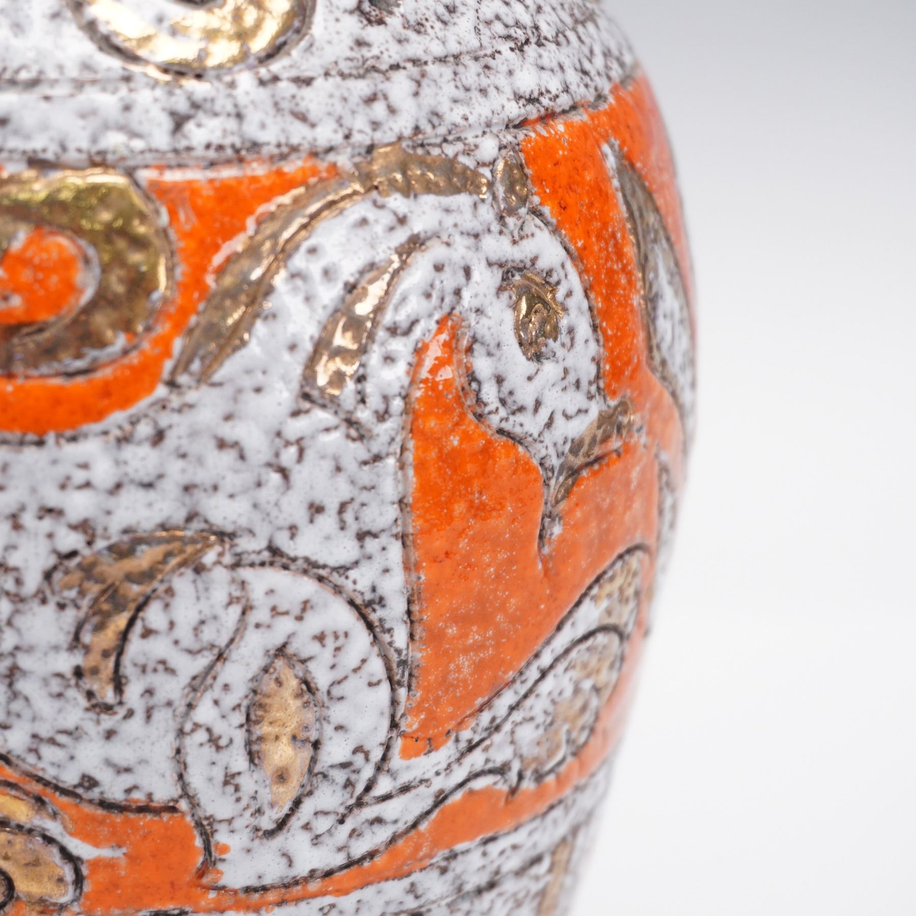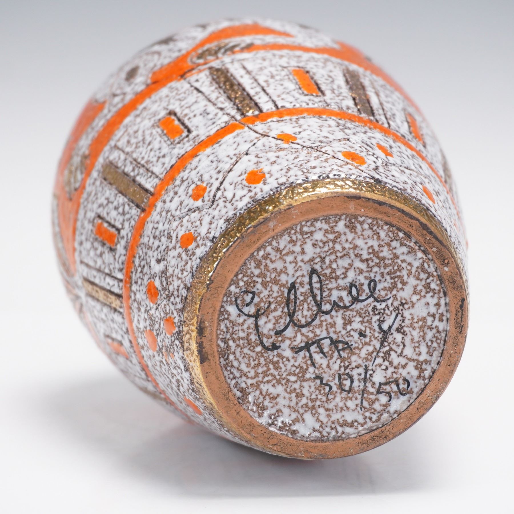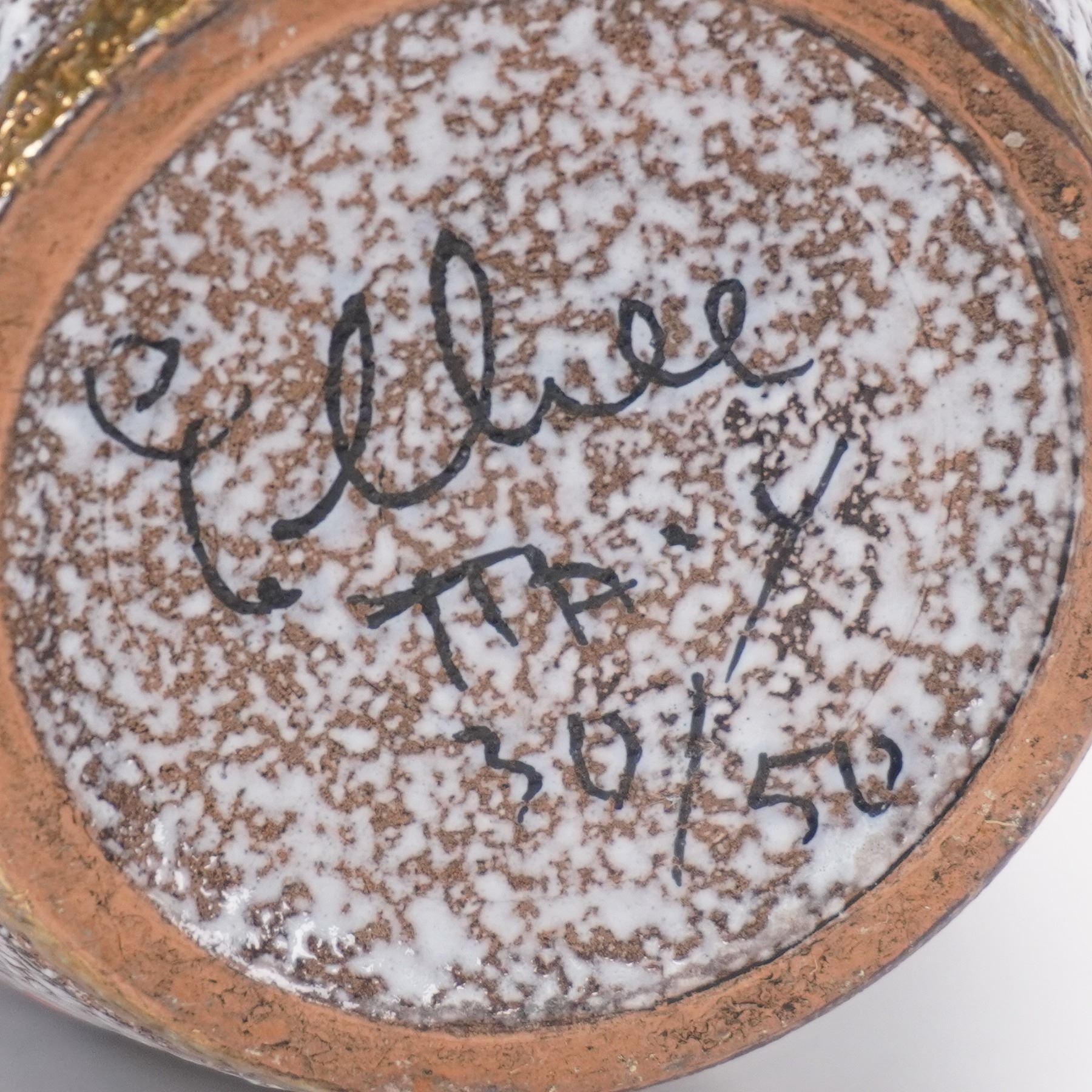This Italian pottery pitcher by Fratelli Fanciullacci features a bold mythological horse motif in vivid orange glaze with speckled white texture and gilded accents. The stylized equine form is rendered with swirling gold embellishments, capturing the energy of midcentury Italian modern design. The pitcher is finished with a sculptural handle and flared lip, both accented in gold. Signed Elbee on the base, this limited edition piece reflects the whimsical artistry and refined craftsmanship of Fanciullacci ceramics. Approximate height 10.25"H.