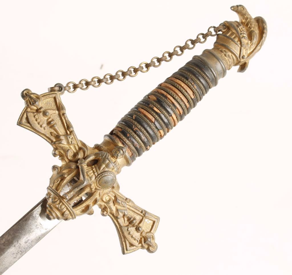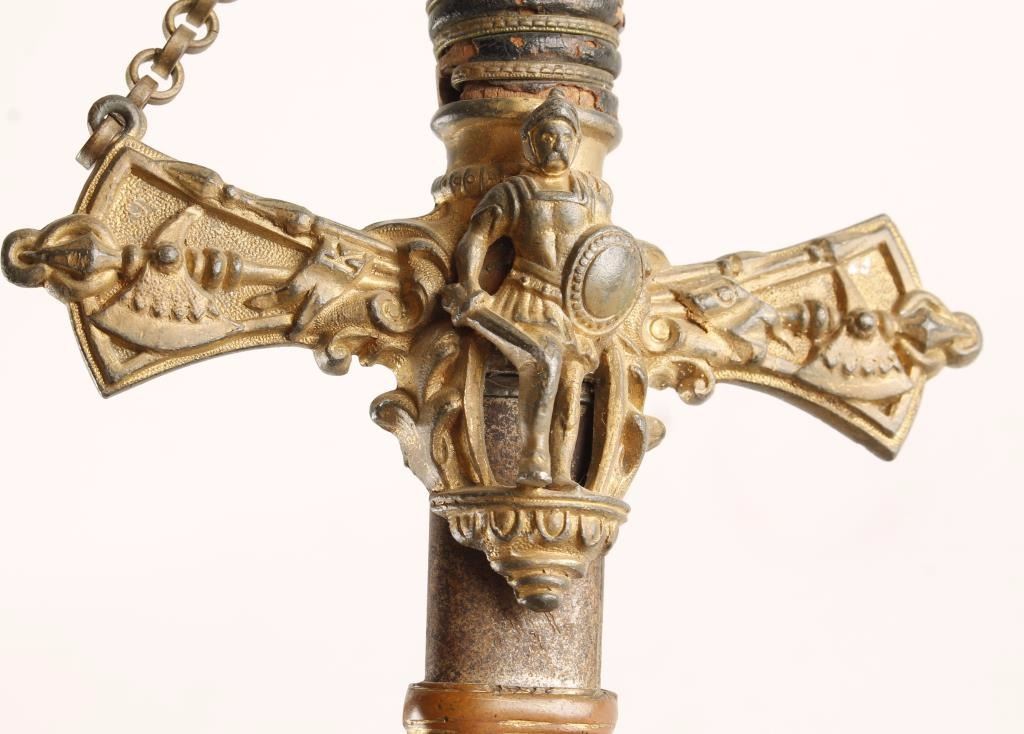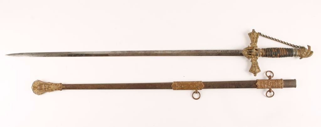 Knight's helmet pommel with "Select Knights" towards top of scabbard, and 'VS' in the center. Made by B.F. Foster Son & Co., 36" long overall. Shows age.