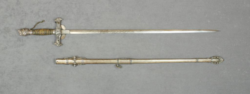 Fraternal Order ceremonial sword and scabbard approx. 37” overall and in untouched out-of-the-attic condition; scabbard shows cast scenes on hanging ring areas and drag; fancy cast cross guard with wire wrapped grip and knight’s head pommel; sword is etched and displays name “Chas. T. Beill”. Est.: $150-$300.
